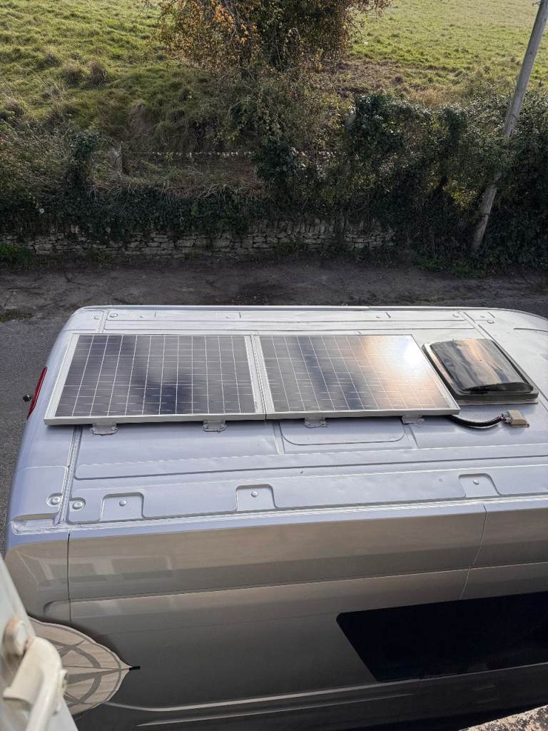 Solar panels and split charge system to two leisure batteries. Shore power socket supplying 240v points.