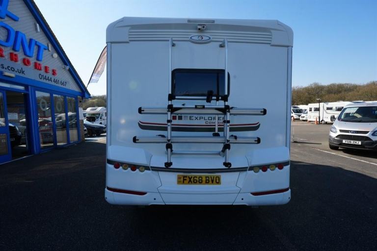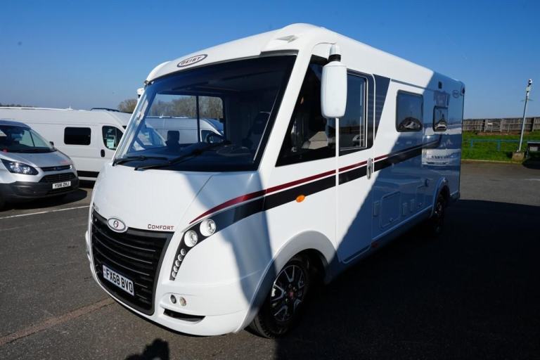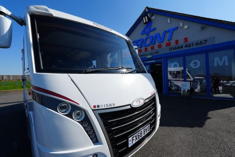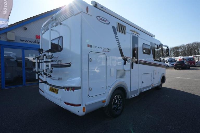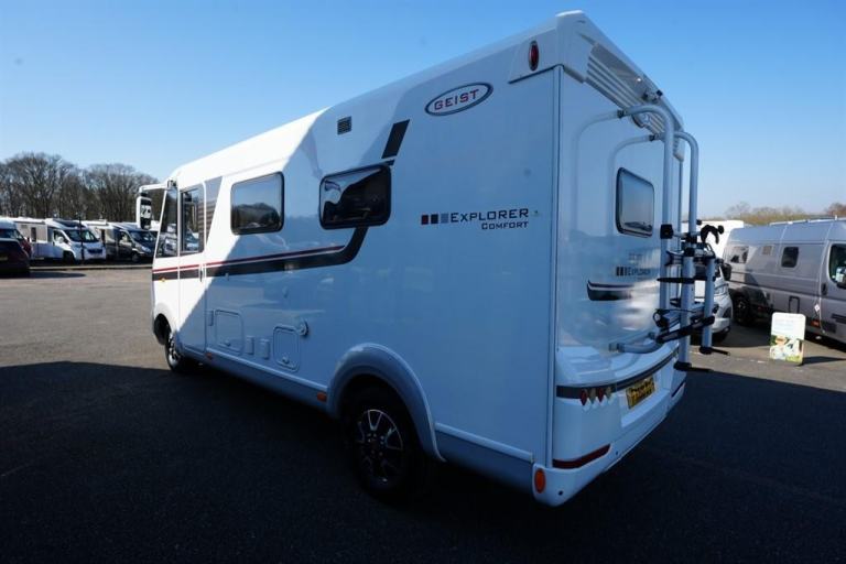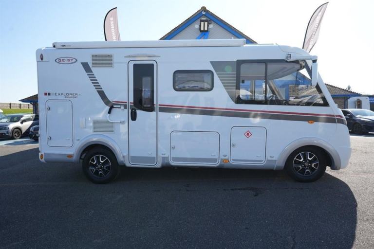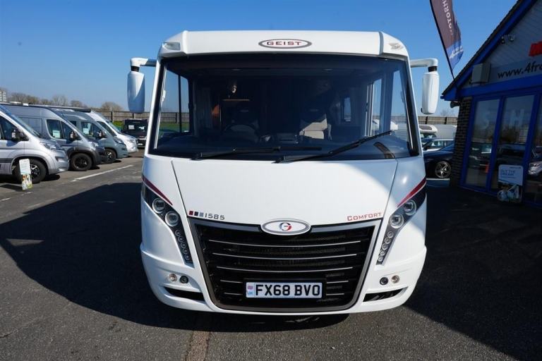 3500 KG Gross weight standard driving licence required only...L-5.99m...W-2.32m...H-2.70m...The Geist Explorer Comfort i585 Automatic A class. Are beautifully executed German build quality, in absolute luxury. Plus as only measuring a compact size, under six metres in length. Therefore easy for manoeuvrability. Makes the Geist Explorer Comfort 585, an quintessential choice for the discerning couples. Who have the desire to explore!!!. With it's surprisingly spacious 2/3 berth 4 travelling seats layout. Together with abundance of storage compartments, for your personal processions used while touring. Now too the elegant rear bathroom, with it's separate shower cubicle, oval hand wash basin. An ideal space to freshen up and looking your best, for the night ahead. Adjacent the compact kitchenette, featuring 3-burner gas hobs, oven, large tower fridge freezer. The perfect space for preparing quick snacks or delightful meals. Moving swiftly forwards too the serene atmosphere/ panoramic views dinette lounge area. Featuring a luxurious L-shaped sofa, that cleverly integrates two front facing travelling seats and also converts into a small child's bed if needed. There's a further inward facing sofa as well. By seamlessly rotating both front captain seats around. Makes an extremely comfortable entertaining space, while occasionally casting yours eyes out at the glorious horizon or the picturesque starry night. Then of a night time there's a pull down adults size double bed over the drivers cab area. The absolute perfect space to experience that cosy nights sleep. Where you will certainly awake up totally alert. The Geist Explorer Comfort i585 Automatic, also benefits from drivers comforts such as cab air conditioning, cruise control, reversing camera, satellite navigation system, solar panel, alarm system, wind out canopy awning, diamond cut alloy wheels, outside gas BBQ point, security lock on habitation door, 2 bar bike rack, cab blinds and will definitely propeller you to new heights on your travels for sure. Plus has been meticulously maintained at 4k, 6k, 8k,9k and 10614 miles.