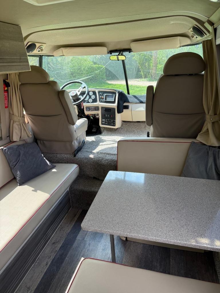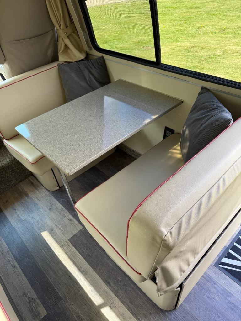 5. Refurbished and upholstered seating giving 4 person dinette and settee opposite which easily convert into two large double beds.