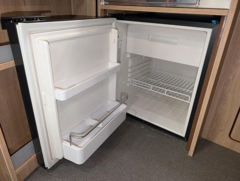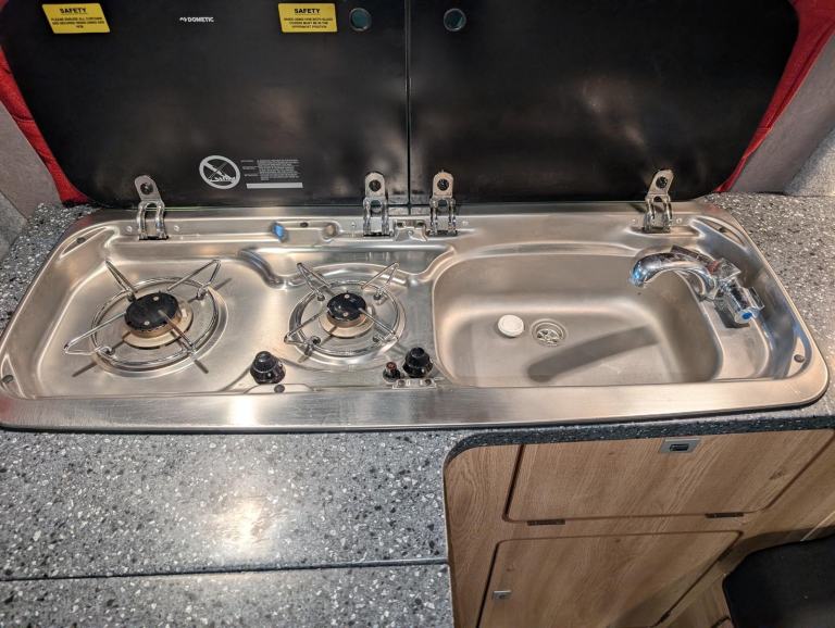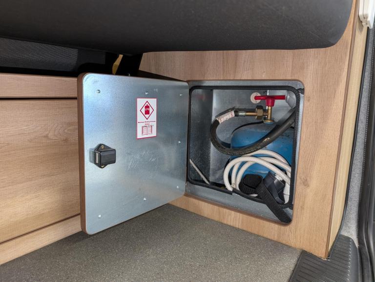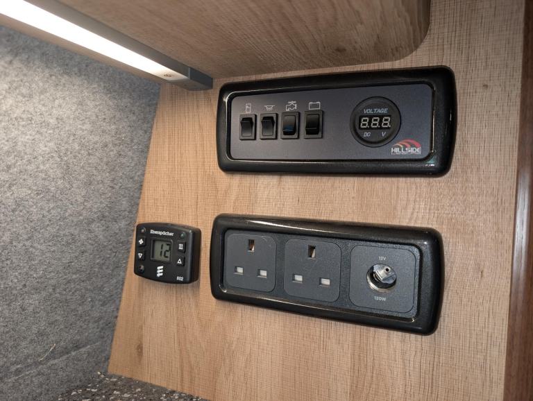 It has 240v hook up, 12v leisure battery and takes a gas bottle