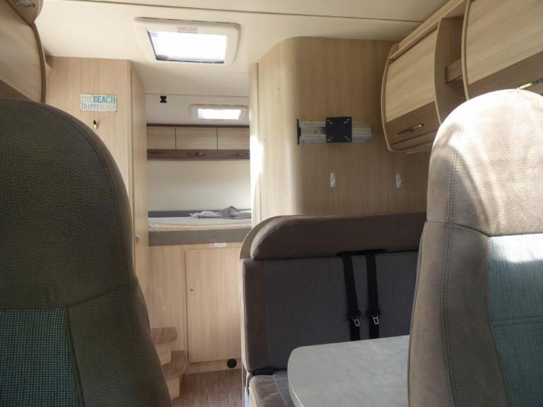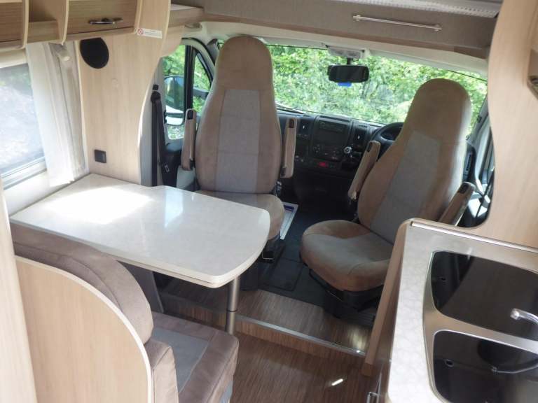 On entry through the habitation door to the right of the vehicle, you will find two forward facing seats with seatbelts. There is a table which displays a half dinette, and can become a comfortable family leisure area with use of the two cab seats which can both swivel.