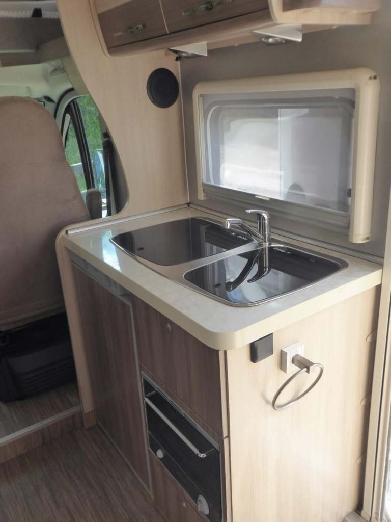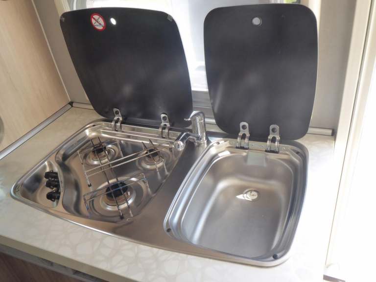 Located in the centre of the vehicle is the conveniently adjacent kitchen. This features an oven, a hob with 3 gas burners, a sink, and fridge with freezer box.