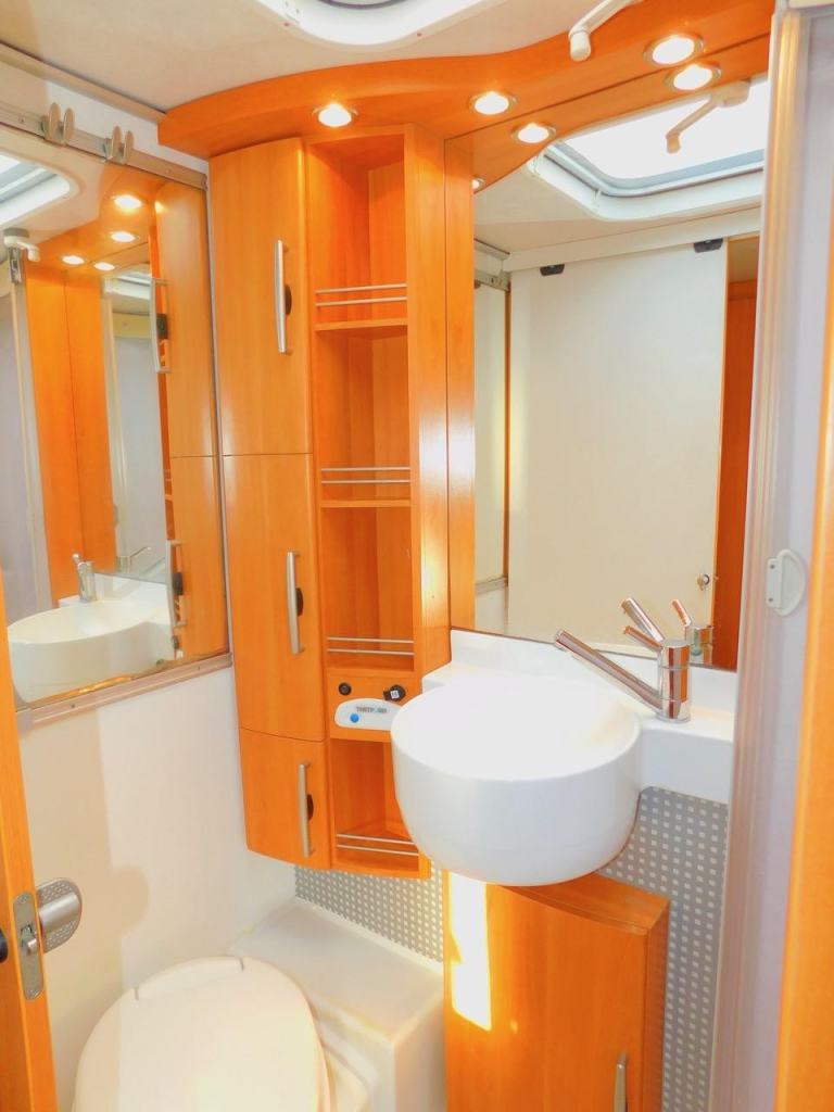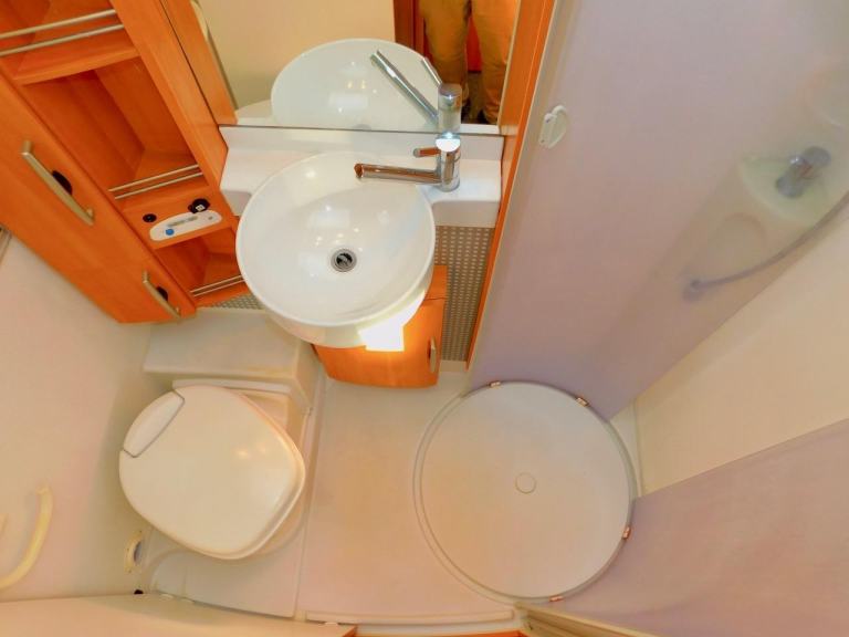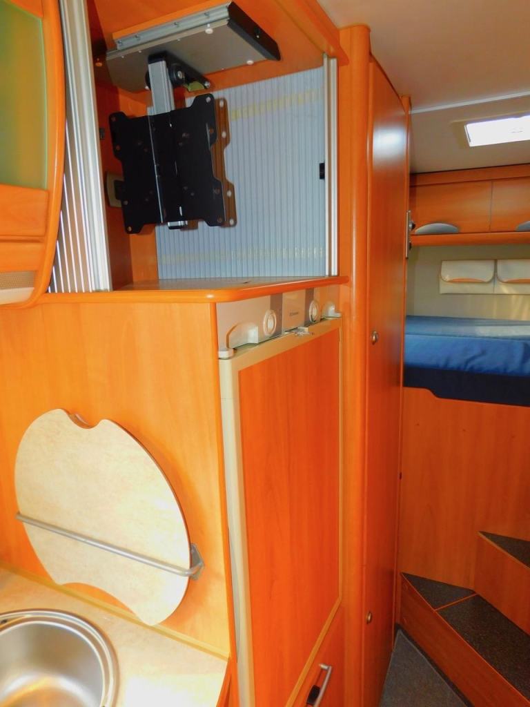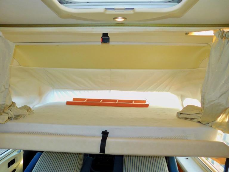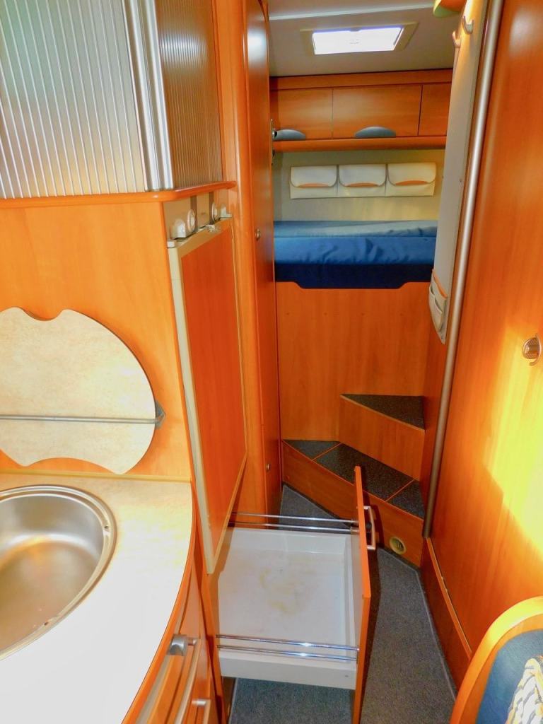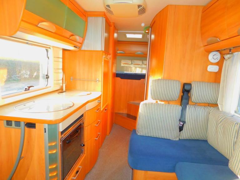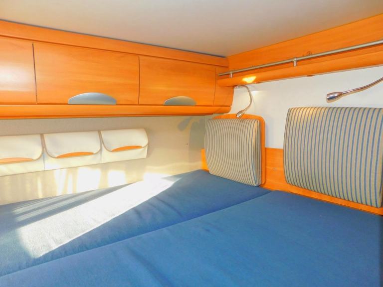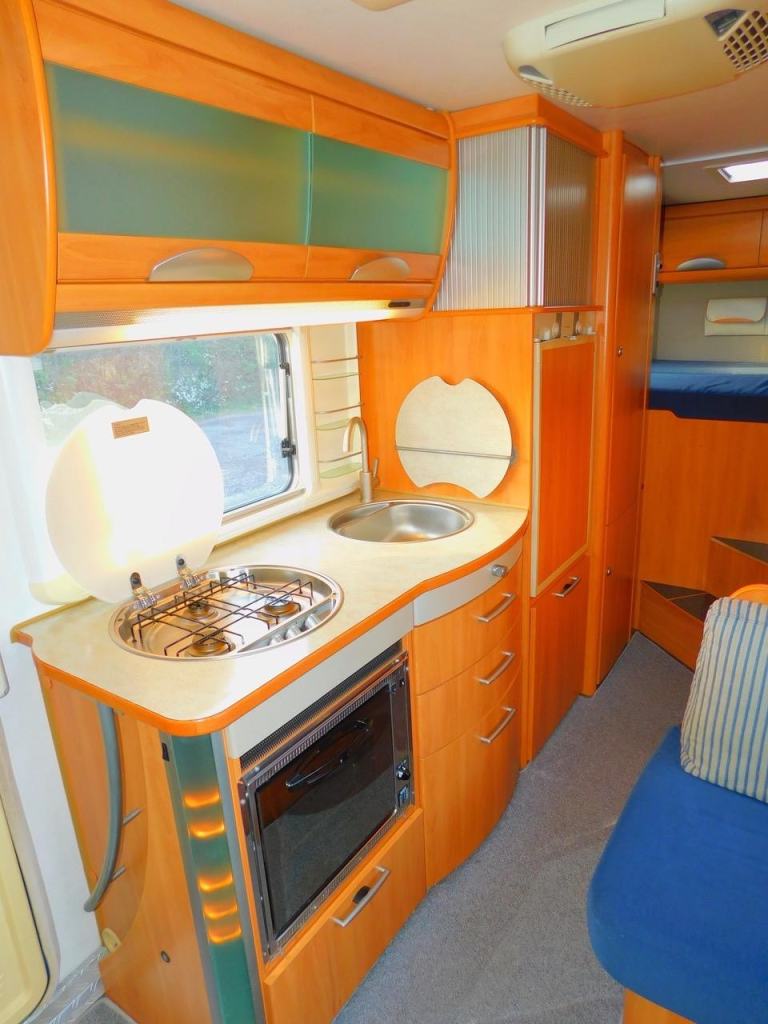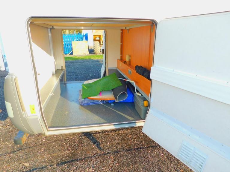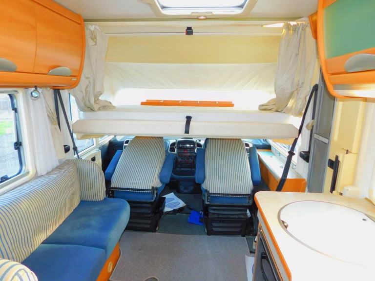 The layout inside this motorhome with 4 berths made up of the large transverse Double bed at the back along with the Huge drop down over-cab Double bed which gives plenty of space for everybody during the day and large generous comfortable beds at night. With a fully equipped Kitchen; Complete with Gas Oven, Grill, 3 Burner Gas Hob and Fridge with a Freezer Compartment. The Large L Shape Lounge and Dining area along with a large generous washroom there is everything you would need to keep two or four travelers comfortable. Outside there is plenty of space under a large awning and with the double floor system there are several storage lockers as well as the large and generous Garage.