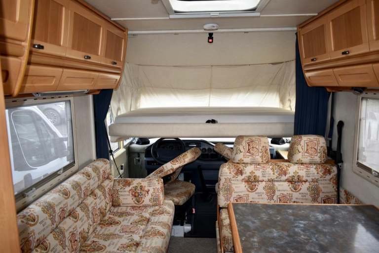 When driving the large windscreen and side windows mean it is a pleasure to drive and at night the Captains Cab seats fold easily to accomodate the huge drop down Additional Overcab Double Bed.Â