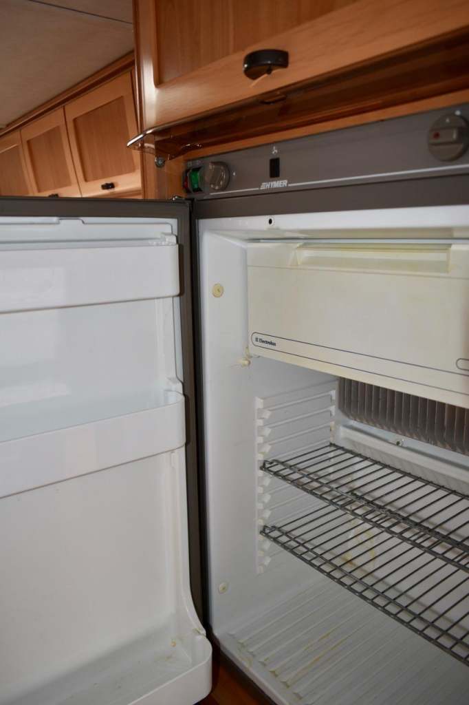 Moving towards the rear there is a generous Double Wardrobe on one side and the Fridge with an ice box opposite and at the Rear of the vehicle is a well equipped Kitchen with Three burner Gas Hob, a Large Stainless Steel Sink and a Large Gas Oven and Grill combination. There is also an Extractor Fan over the Kitchen area.