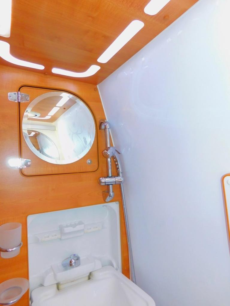 Opposite the Kitchen we have the Spacious Washroom/Shower with a pull down hand wash basin and a stylish vanity mirror Cabinet. We also have the stylish LED ceiling Lighting with an Integrated Extractor Fan. This beautiful IH TIO 630 RL features stylish alloy wheels, a Large Colour Coded Front and Rear Bumpers with integrated Reverse Parking Sensors, A Large Roof Mounted Solar Panel, Cab Air Conditioning, Cruise Control, Integrated Sliding Remis Cab Blinds, a tow bar with Electrics, outside gas BBQ point, and an Electric Habitation Door Step, Avtex LED TV, and a roof mounted Digital TV Aerial etc etc. This also has the fixed rear panel to avoid squeaks.