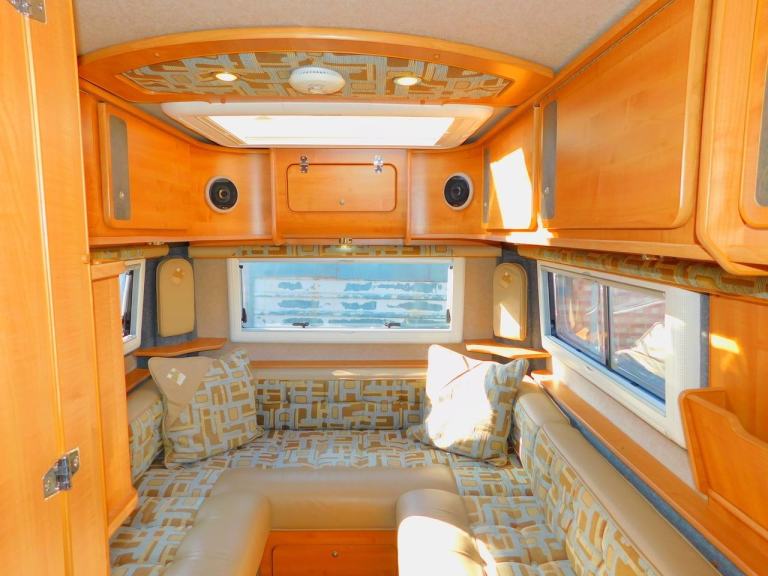 This IH 630 RL certainly oozes British solid hand built craftsmanship. Throughout we have the spacious bespoke and incredibly versatile 2 berth with 2 travelling seats configuration. We even get a plethora of storage compartments for your personal possessions, needed whilst travelling. The Large Rear Lounge with its wrap around windows and large Sunroof gives you panoramic views and is Lovely perfect space to Relax and to Stretch out and watch the built in Avtex LED TV; should you wish. Both of the front captain seats rotate to become part of the social area should you need that extra seating. Then when its Bedtime and you are ready to experience a cosy nights sleep!! We get the added advantage of Sleeping as 2 Large Single Beds, or this area will effortlessly transform into a Huge size Double Bed. The Kitchen is really well designed and features include a 3-burner gas hob, a combination Gas Oven and Grill and a good size Fridge Freezer. An ideal space for producing a quick Lunch or tasty meals. We also have Truma Gas and Electric Heating and Hot Water, as well as Double Glazing with the Windows and Sunroof featuring Luxury Sliding Privacy Blinds and Flyscreens.