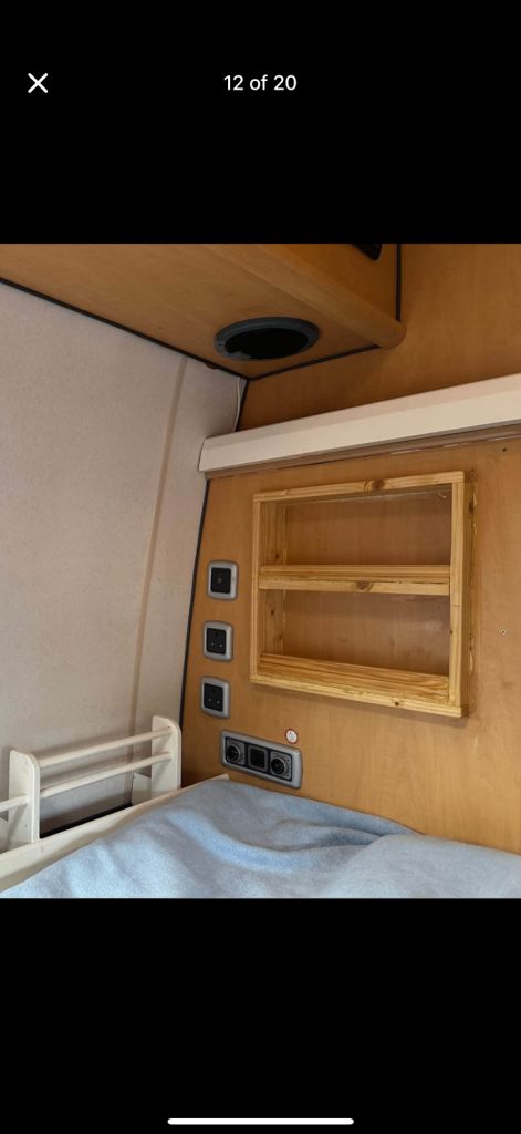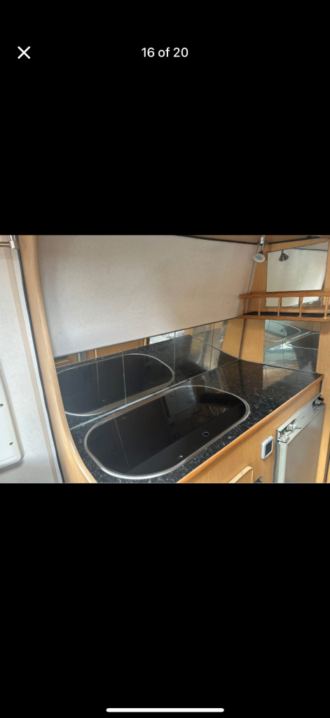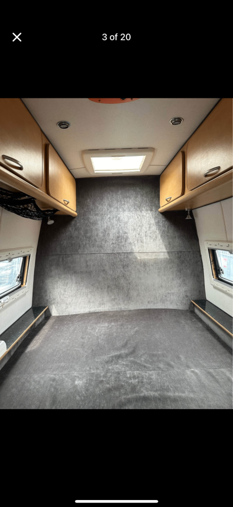 King size fixed bed, lots of storage. 4 forward facing seats with seat belts, front ones rotate, rear ones fold down, pedestal table removable. Sink, hob, oven, grill, fridge uses gas/12v/240v. Toilet (Thetford cassette) basin shower. Water heater, gas air heater, 120lt water tank, solar panel constantly charges leisure battery. Storage under bed from rear doors. 4 side windows, 3 roof lights. All open and all with blackout and fly screens. Full length awning. Thermal blinds for front windows recently had full close door respray. Previously had underside professionally cleaned, wax coated to protect from the elements of the weather. Only reason to sale of our family is growing and we just haven’t had time to use it this year.