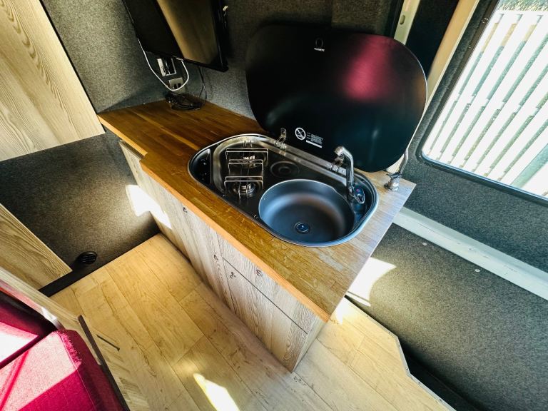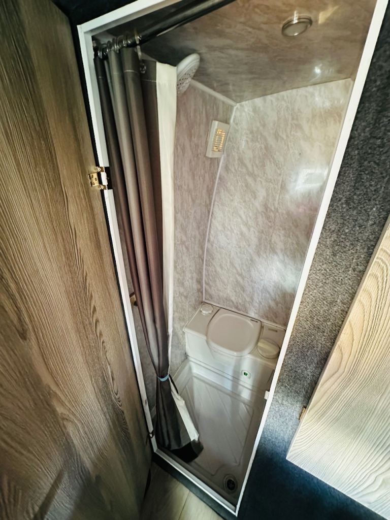 SIDE KITCHEN WITH SINK HOB FRIDGE MICROWAVE REAR WASHROOM WITH SHOWER SINK CASSETTE TOILET