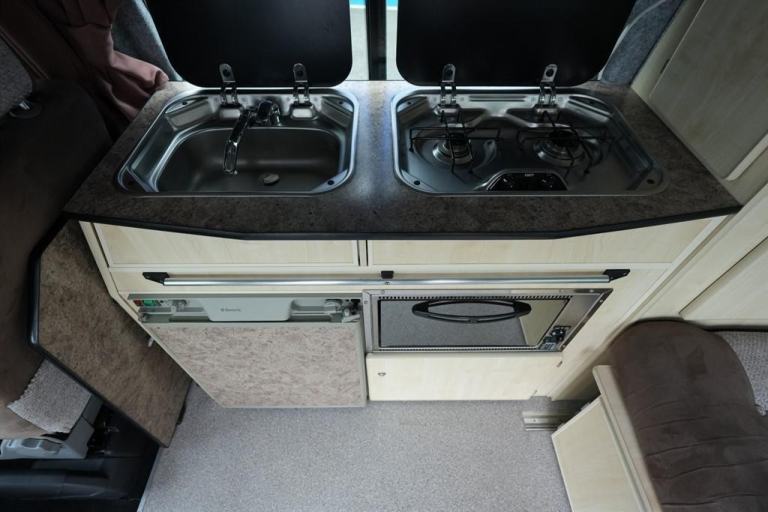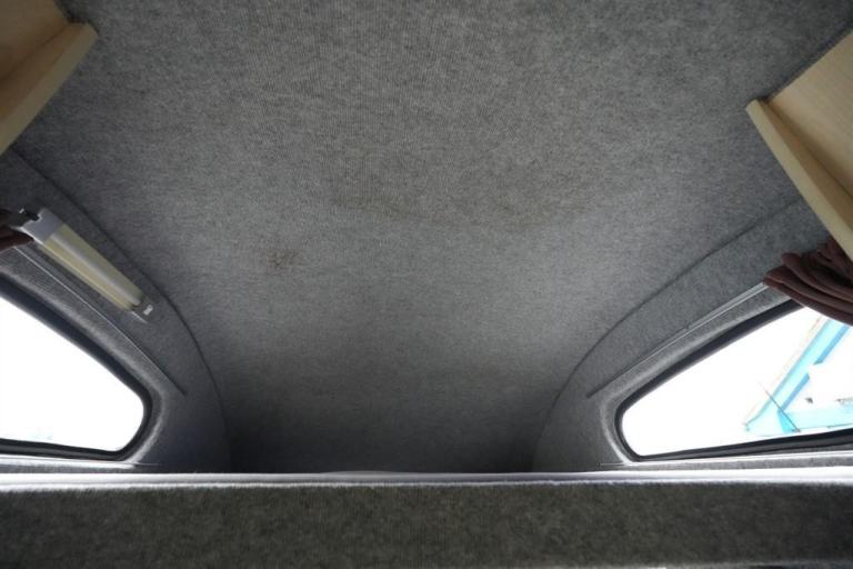 multi functional dinette lounge area. Consisting of a two fronted facing integrated travelling seats sofa and simply rotating the front passenger seat around. Makes a comfortable relaxing space, while you tuck into that chilled bottle of wine. Then finally will effortlessly transform into an adults size double. Where you will certainly experience that cosy nights sleep. Above there's a very small bed, for little people. The Leisuredrive Crusader will definitely elevate your adventures together for sure.