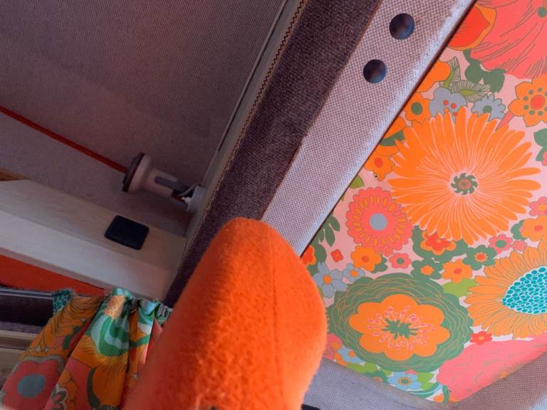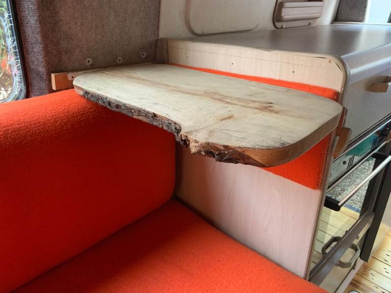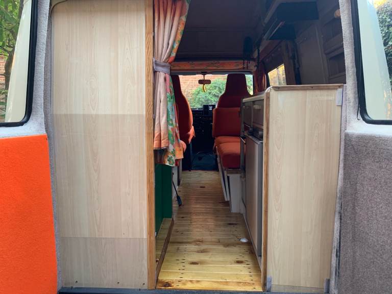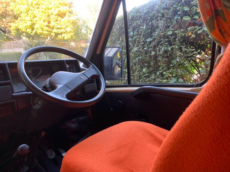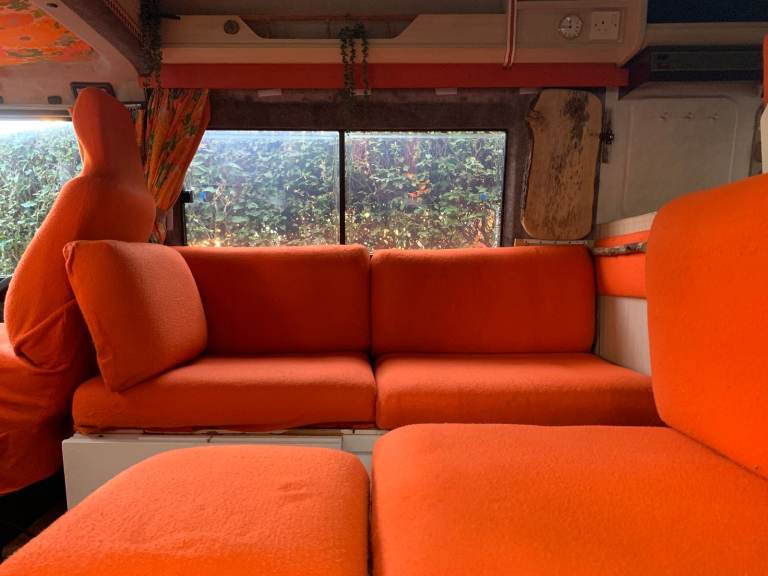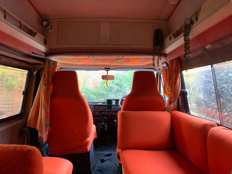 It looks great inside and we worked hard on the interior including colourful curtains, orange seat covers, a wooden floor and a space saving contraption to make the bed easier to install, doing away with the annoying and cumbersome slats you usually need to bring. A joy to spend time in. It looks and feels so much better than the usual tired, old, dirty brown interiors of most other Talbots being sold.