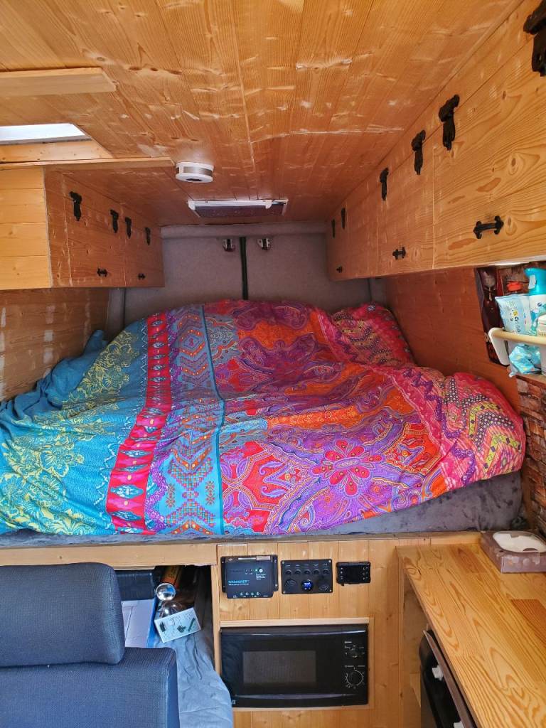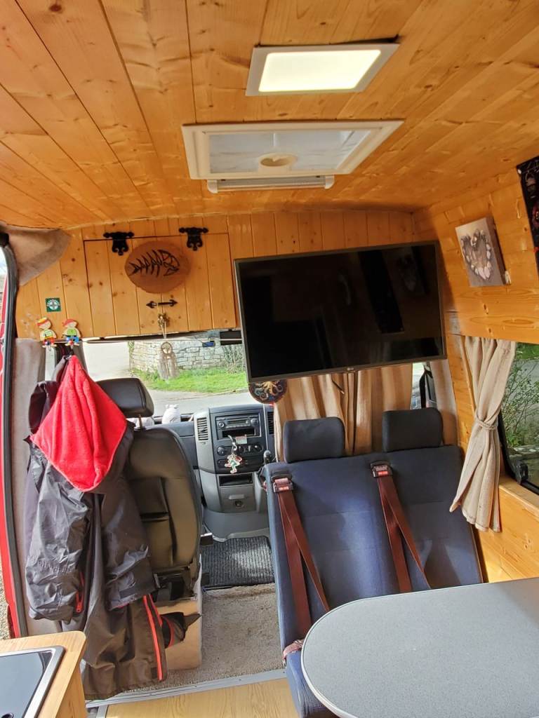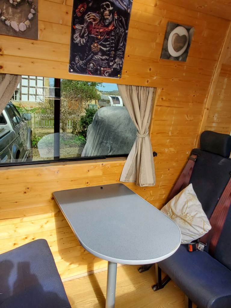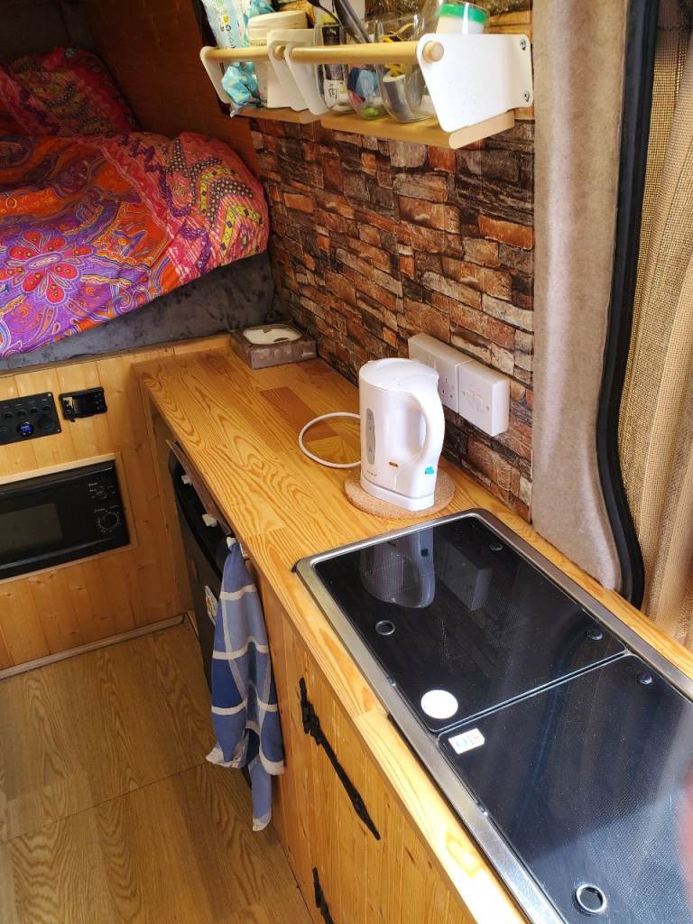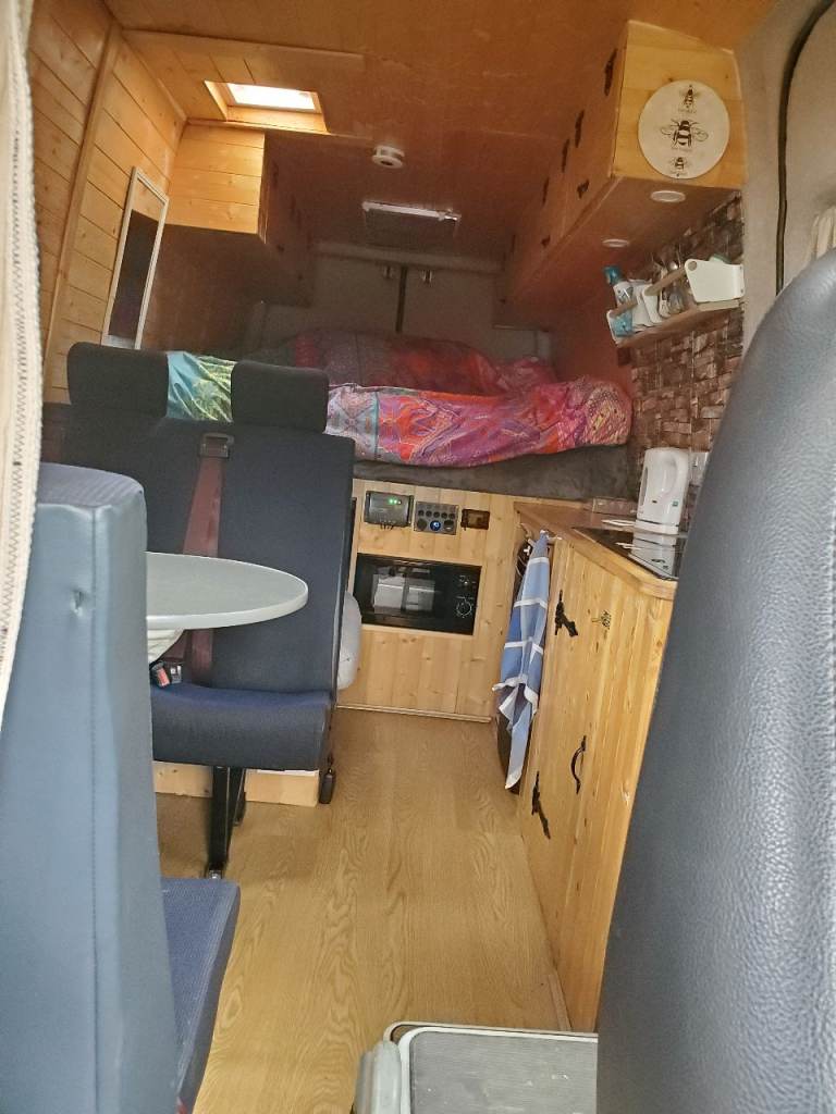 converted into a cam,with a king-size bed, also a single / storage space, solar panel on the roof, ehu, microwave, gas/electric fridge, sink with electric water pump,2 gas hob, 4 seats and table with flat screen TV, passenger seat is a captains chair drivers seat is heated leather,night diesel heater, van also has wind out awning, this is a old van, it's been used.and shows signs of wear and tear, mot April 2027, 4 new tyres, new leaf springs, breaks,pads and disk and rear pipes all new, new egr valve plus more