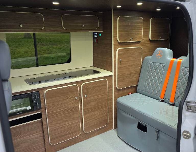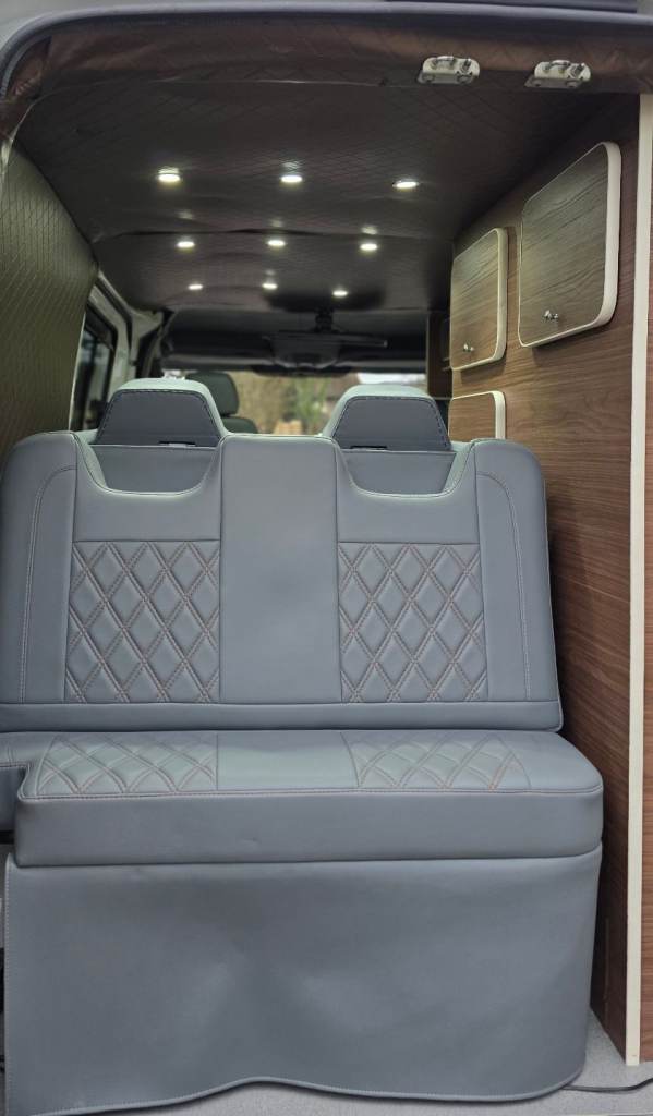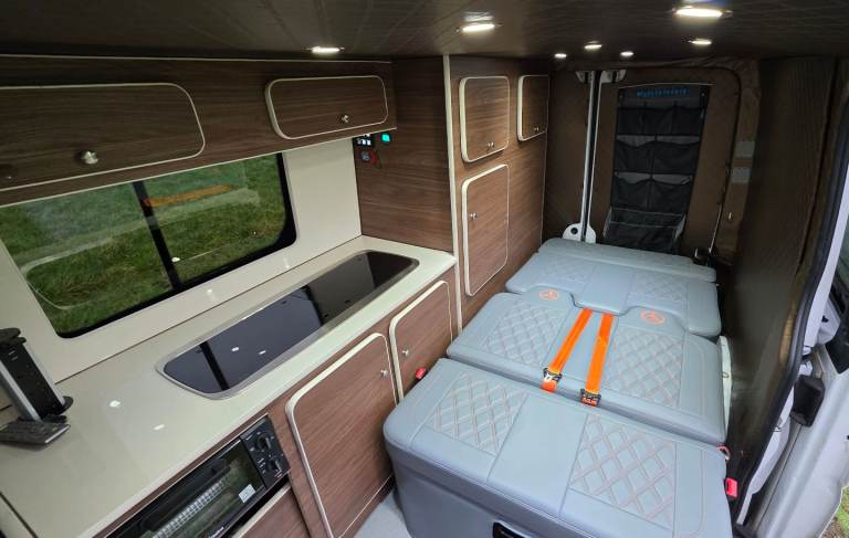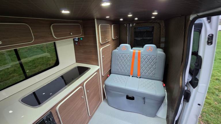 The interior features a modern camper conversion with grey diamond-stitched leather seats and orange accents, creating a stylish and comfortable living space.