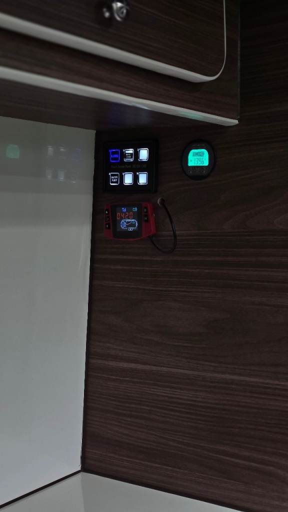 Equipped with a touchscreen multimedia system, flat-screen TV, LED interior lighting, and a full electrical control panel with power management.