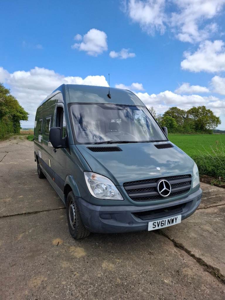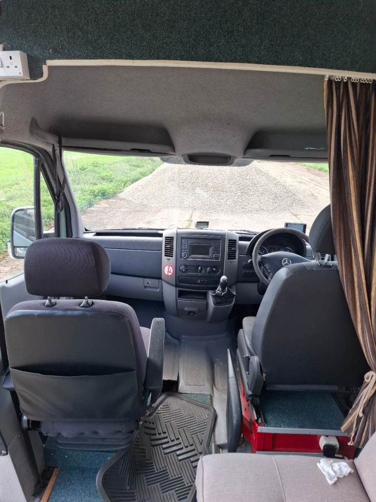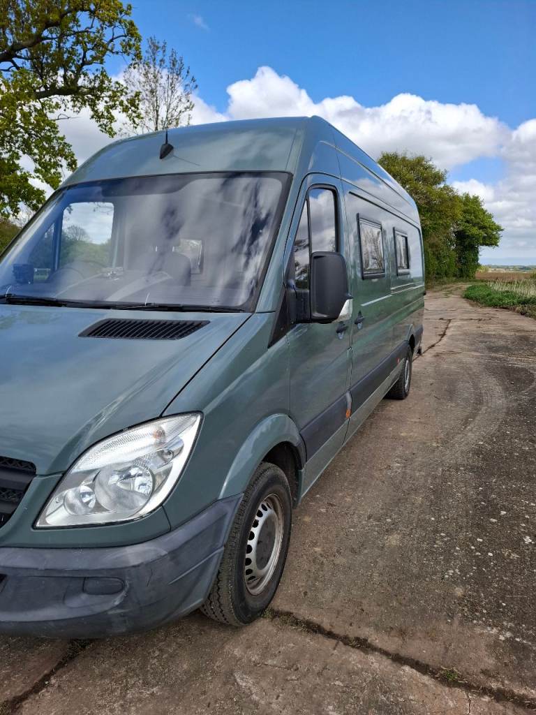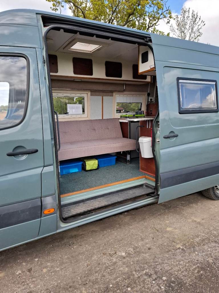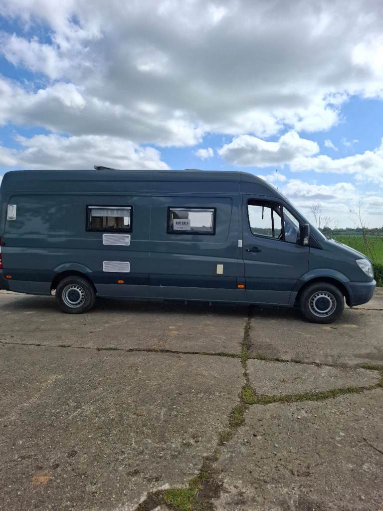 Low mileage sprinter with rust fee body, recent mot. Dometic fridge, Thetford cooker, shower and toilet, large garage.