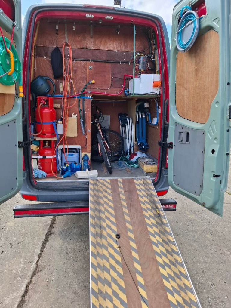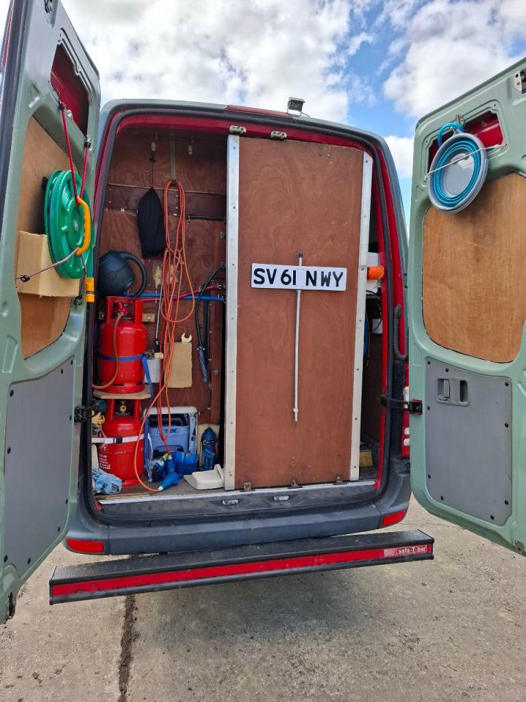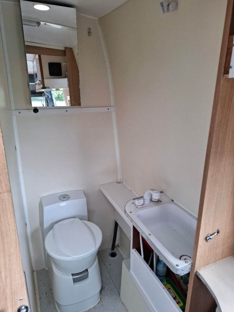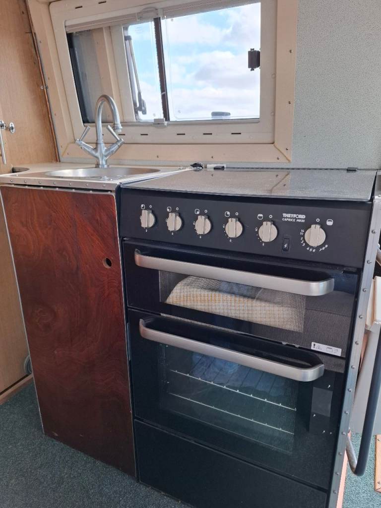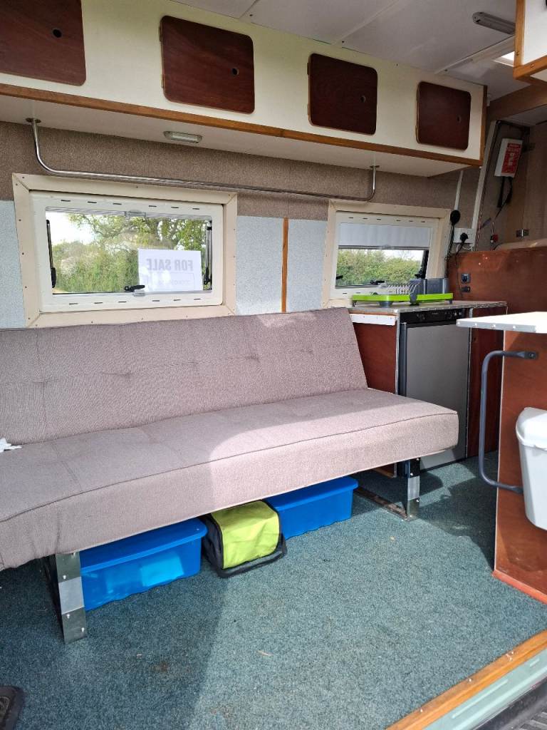 Low mileage sprinter with rust fee body, recent mot. Dometic fridge, Thetford cooker, shower and toilet, large garage.