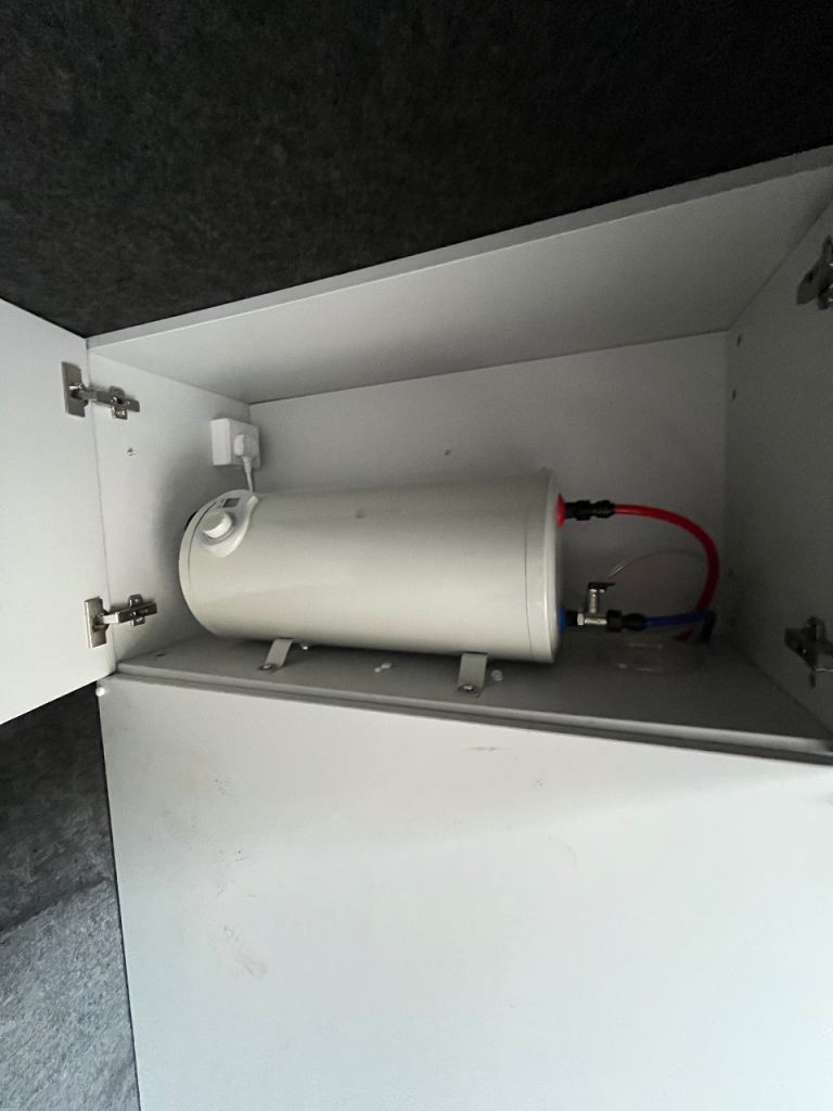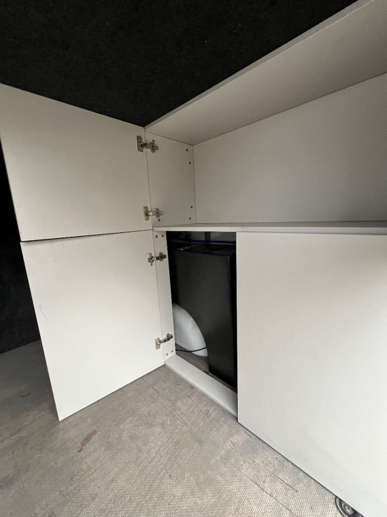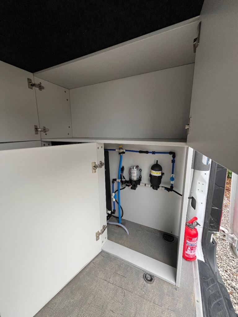 The garage has plenty of storage where the 100L water tank, water heater and water pumps are located for easy access, the 100L water tank has an easy fill point on the exterior of the van.
