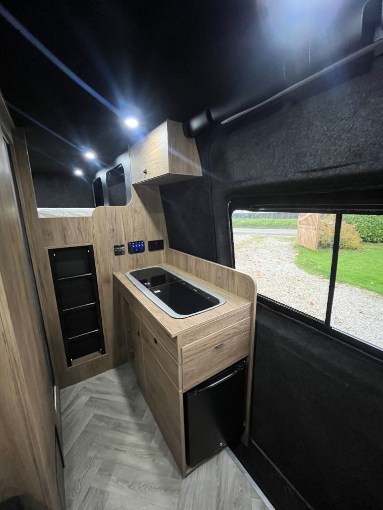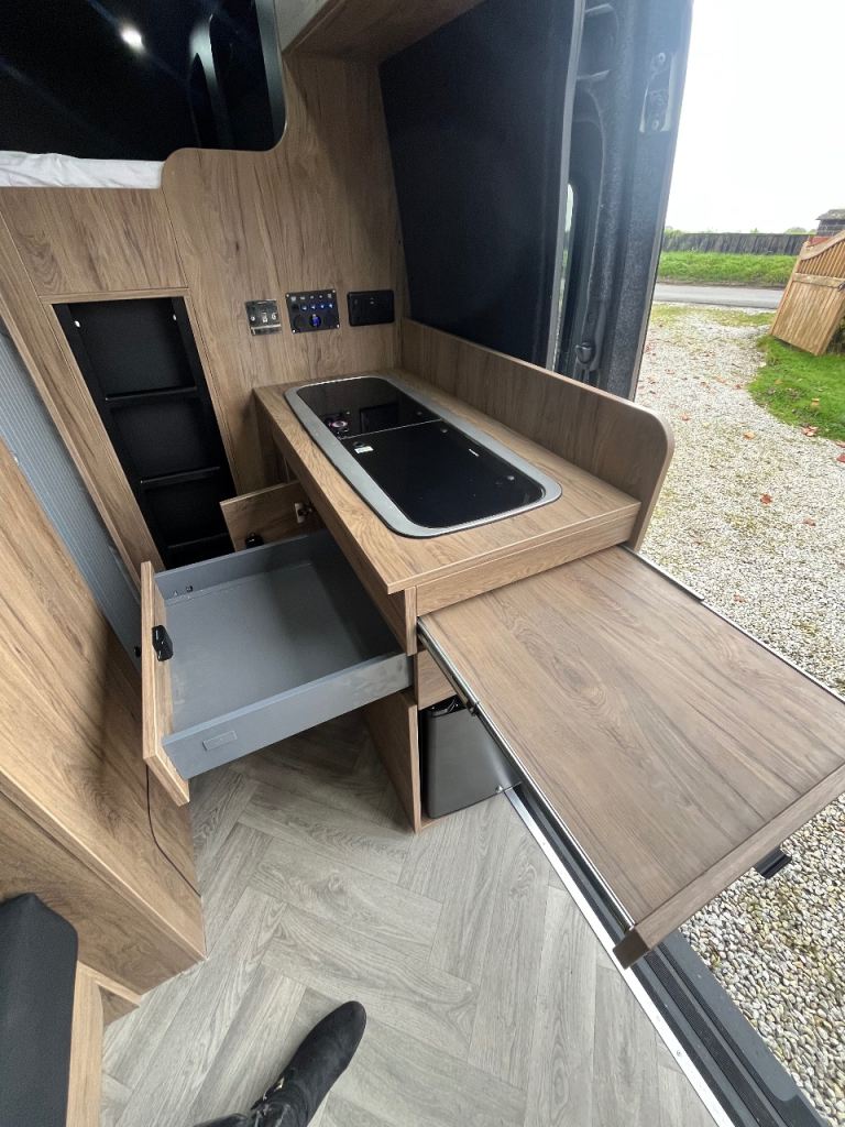 Kitchen area has a dometic 9222 sink and gas hob with 12v/240v fridge and plenty of storage under, there is also a pull out worktop to give extra room for food prep.