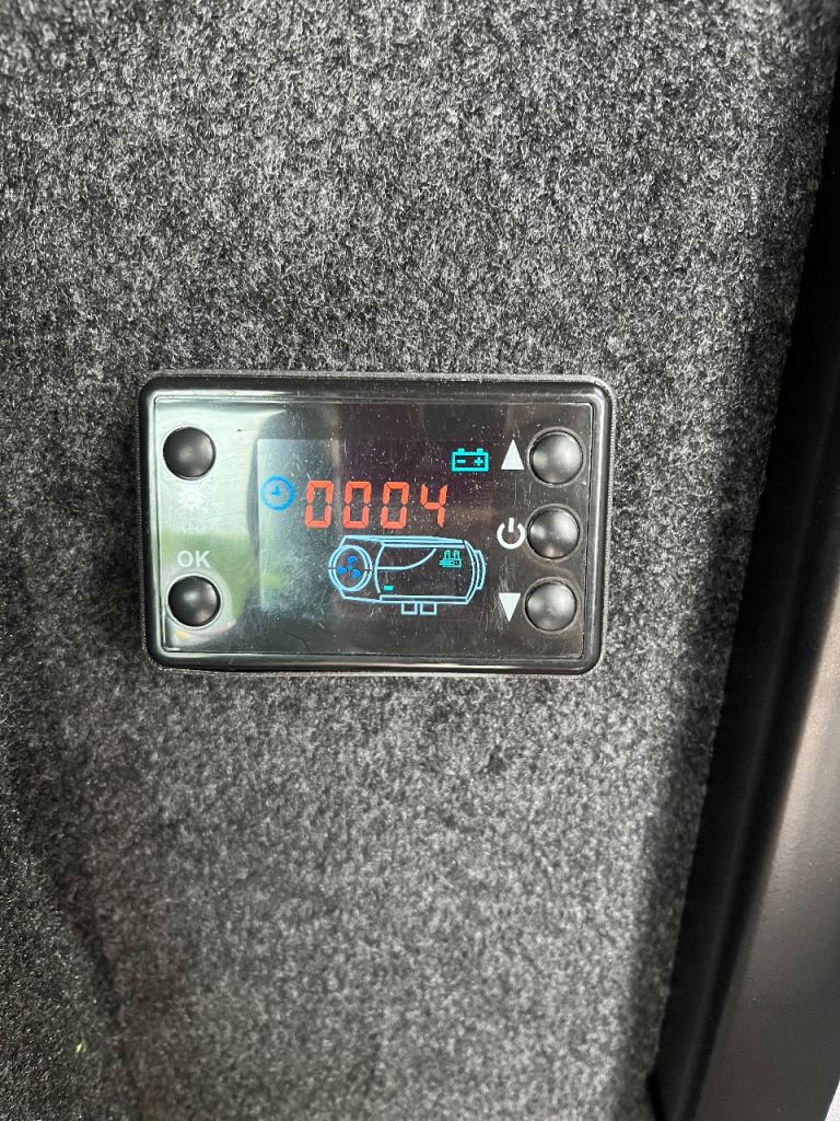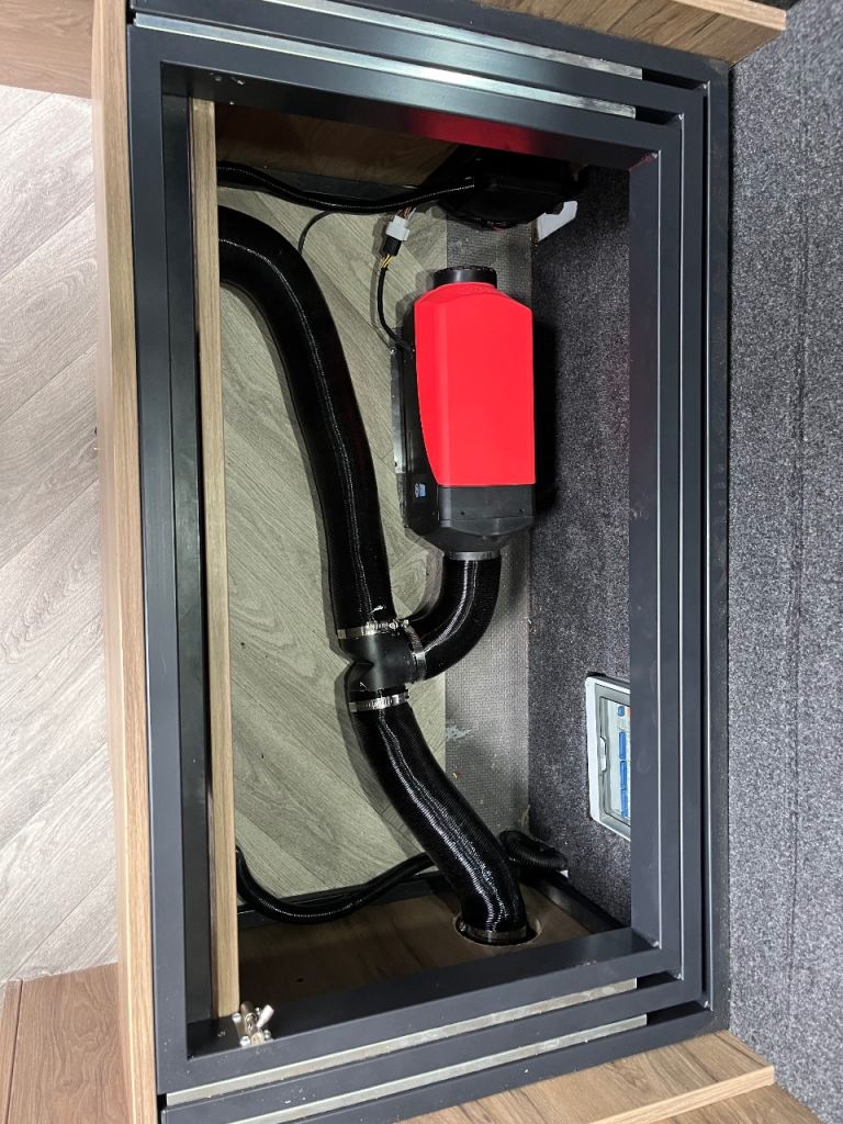 Diesel night heater located in the under seat storage, blows hot air throughout the living area and into bathroom