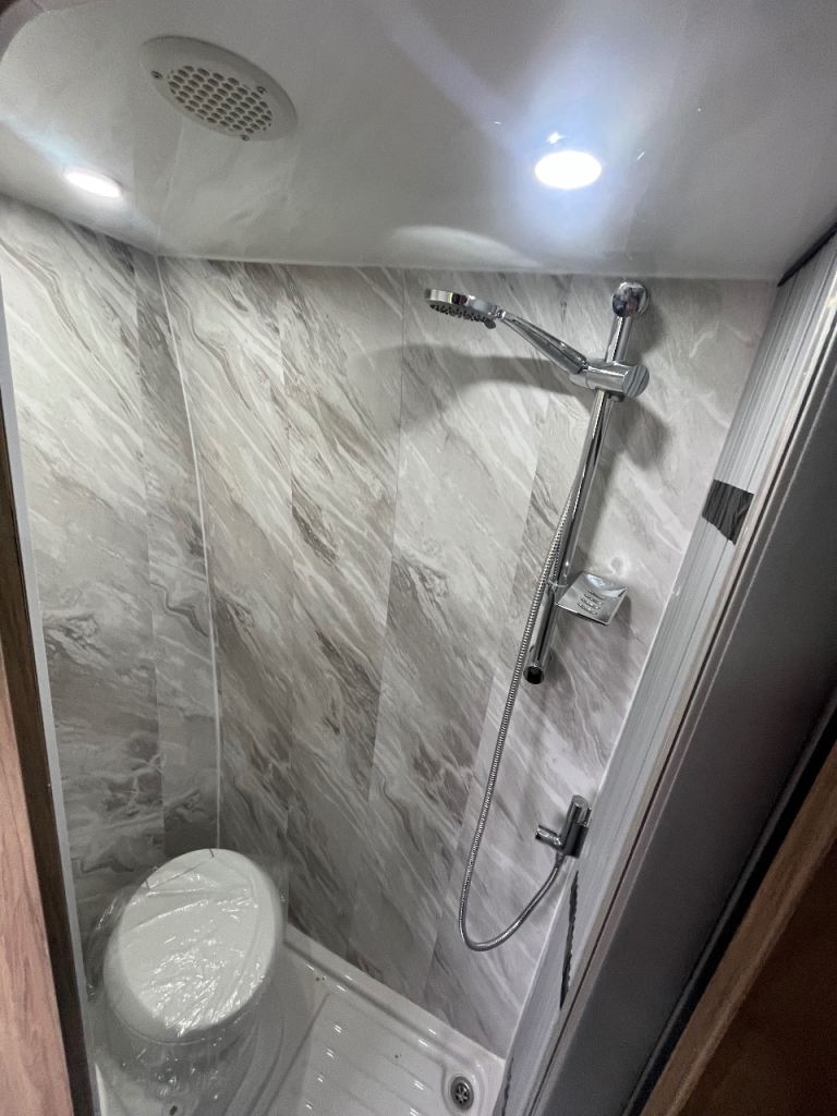 Bathroom has a mixer shower and electric flush Thetford swivel toilet, Bathroom has an extractor fan in the ceiling.