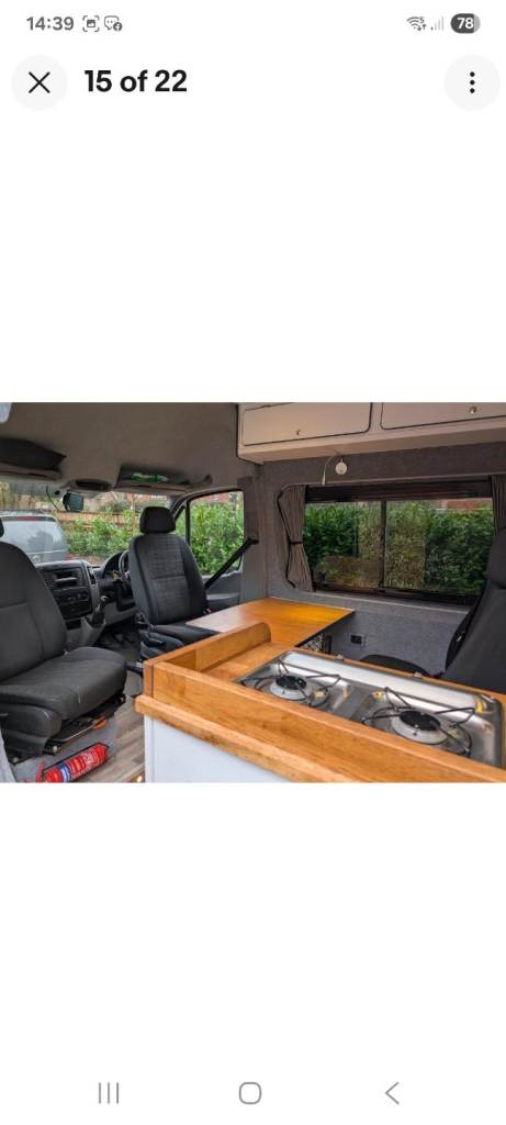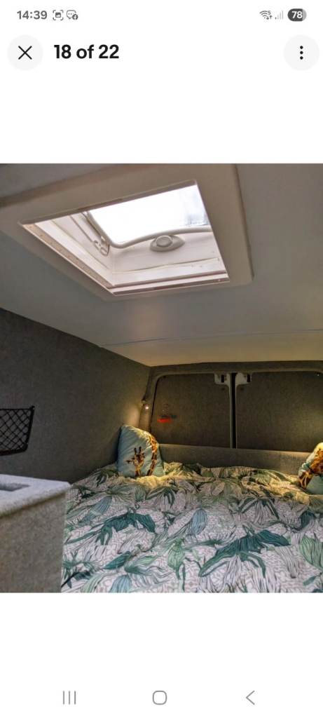 Recent replacement brakes all round - pads and discs high roofRhino full roof rack + access ladderInside:Converted to a high standard - fully insulated, vapour barrier and noise deadened Good standing room insideRemovable double bed (can split down to 2 single beds)Large wind out Thule awning Rotating front seats + 2 fixed table seats (i.e. table seats 4)Made to measure internal front blindsToilet/wet room cupboardLarge 'boot' for storage under bed Appliances:Fridge/Freezer (12v)2 Ring gas hobTV (12v) + external aerial + boosterWater 12v pump + removable watekr tankElectrics:2 x 110Ah Leisure batteriesSolar panel + charge controllerSterling Battery to Battery chargerUSB sockets throughout 240v camping hook up charger + pinsockets