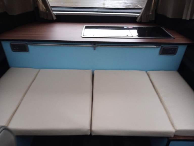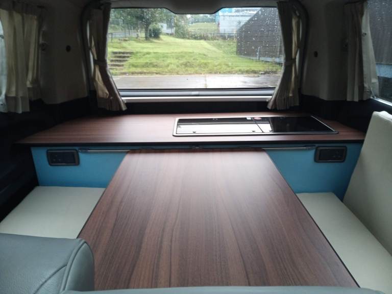 We bought it in 2021 and we got it converted in 2022. We put a kitchenette to the rear (with vitrifrigo fridge and fully functioning sink and gas hob with some storage below), a table inside with fold down bed for a child. They also fitted a leisure battery with electric hook up under bonnet.