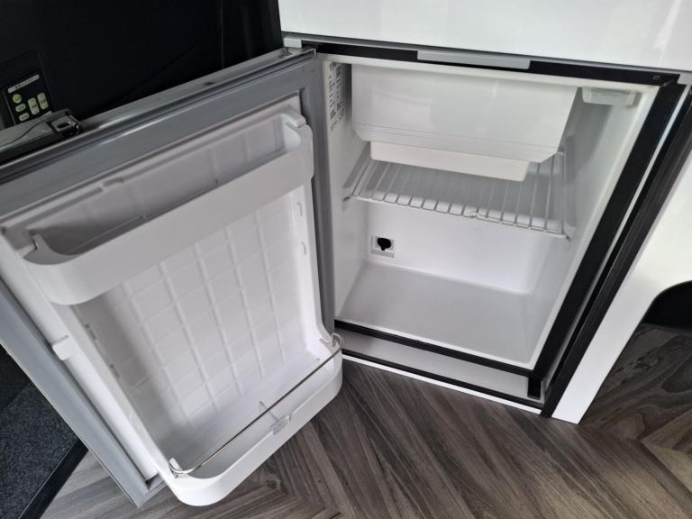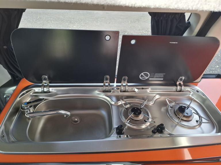 An essential side galley features a Dometic gas hob with two burners, a Vitrifrigo 12v fridge with a freezer box, and a sink with pumped water from an onboard tank.