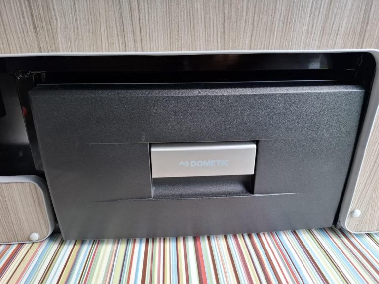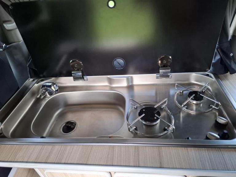Behind the cab is an essential side galley with hob with two gas burners, and a sink with pumped water. The rear bench seat (which has two 3-point seat belts) can be fronted with a removable table, and enhanced as a leisure/dining area by the use of the swivel cab passenger seat. Beneath the rear bench seat is a Dometic drawer fridge.