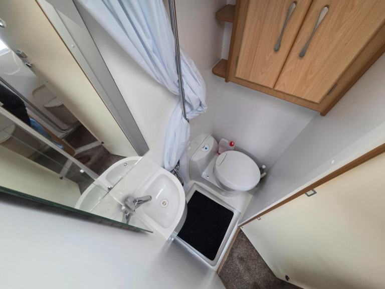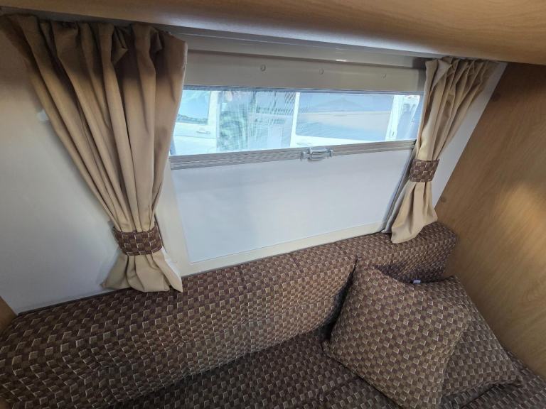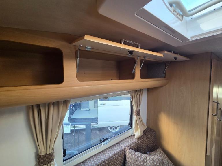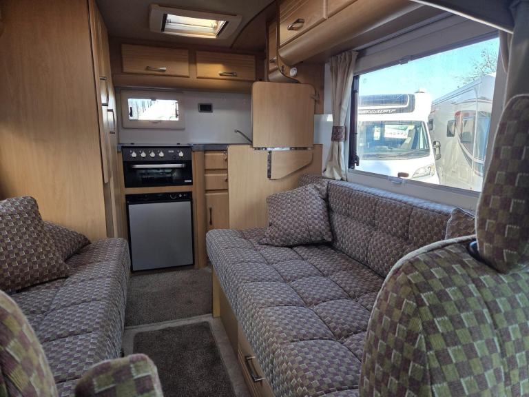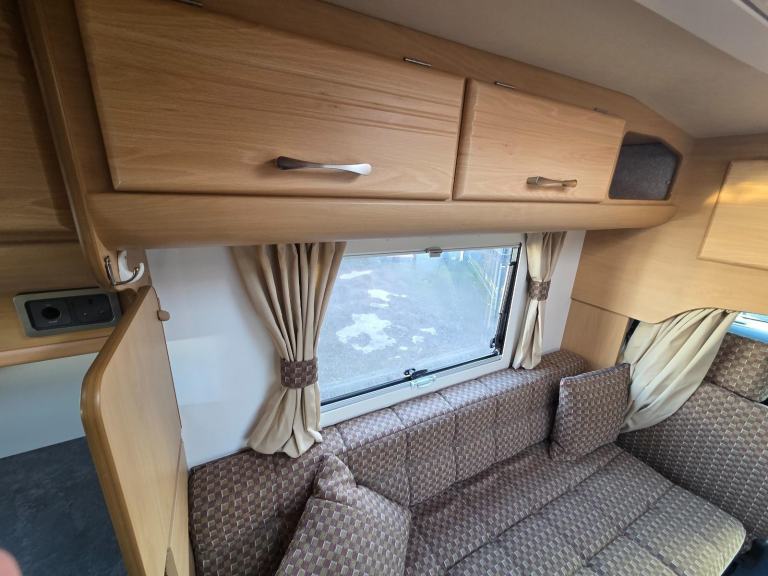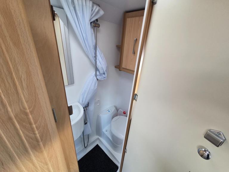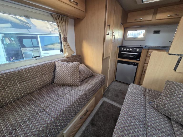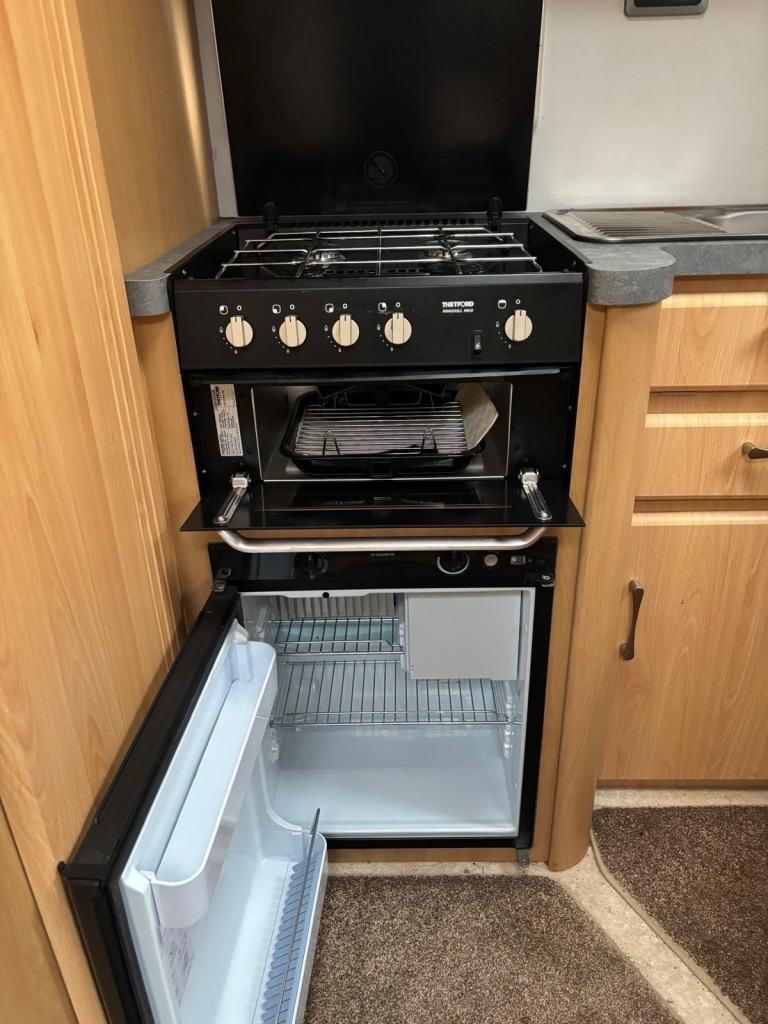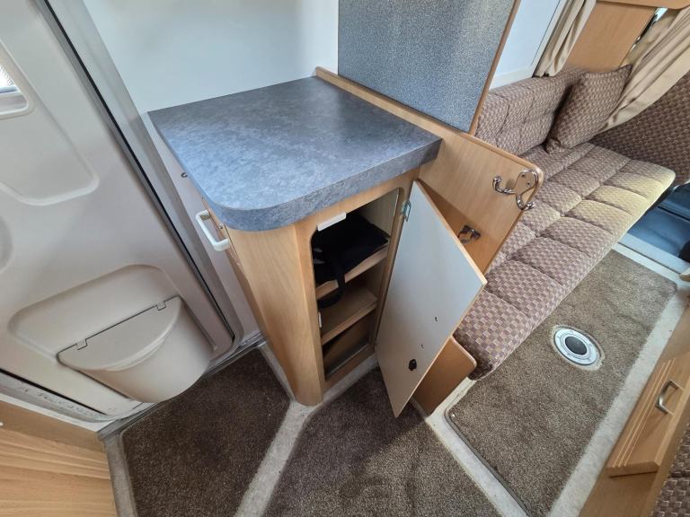 The kitchen has good worktop space with the use of the cabinet opposite as well as a 3 way fridge with freezer box, sink with built in drainer,4 burner gas hob, grill, storage for the groceries. There is a drop down table behind the rear passenger seat which you can use for your stand alone TV.