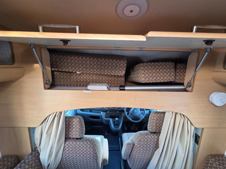 The nearside is long bench settee and opposite is a long bench settee with storage underneath. These can be made up into 2 x Single beds or they pull together to make a massive double. There are wrap around cupboards overhead as well a good sized wardrobe for the size of the van. There is also a large locker over cab which is great for the duvet.