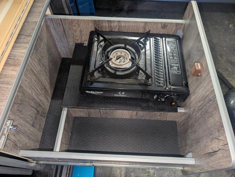 There is a pull out drawer section with a portable gas stove