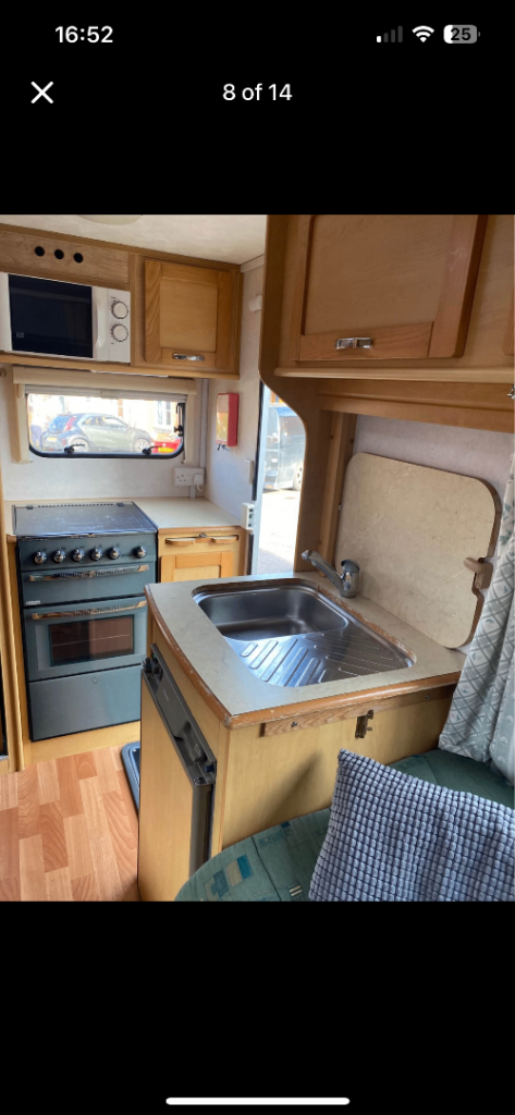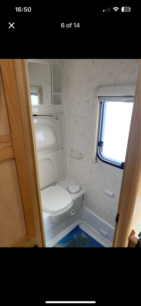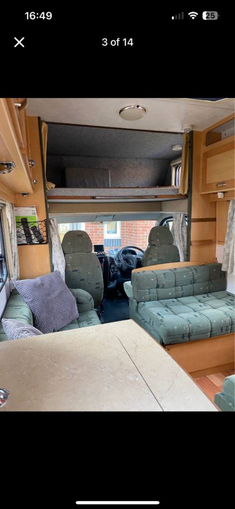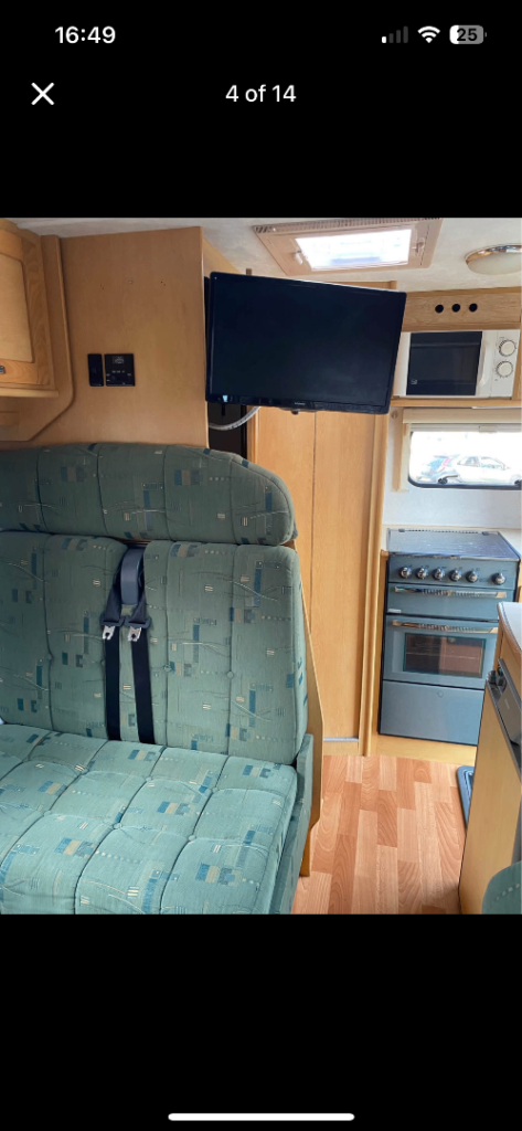 Solar panel, gas heater, satellite TV, full cooker, microwave, fridge with freezer compartment, swivel captains chair, cassette toilet and shower. 4 seatbelts