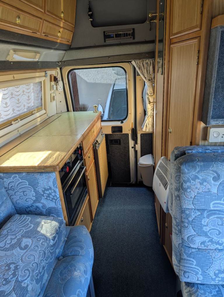 Peugeot Boxer 2.0 petrol 2 berth campervan. 12 months mot. Two new Avon front tires, tow bar, two sets of keys, folder full of paperwork inc old mots and booklets for the appliances. Upholstery is in vgc no rips or tears. Hot and cold running water, blow air heating, toilet with shower,3 way fridge,gas hob with grill and oven below all working as they should. Brand new drive away awning.