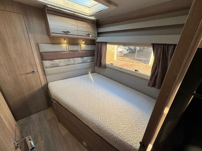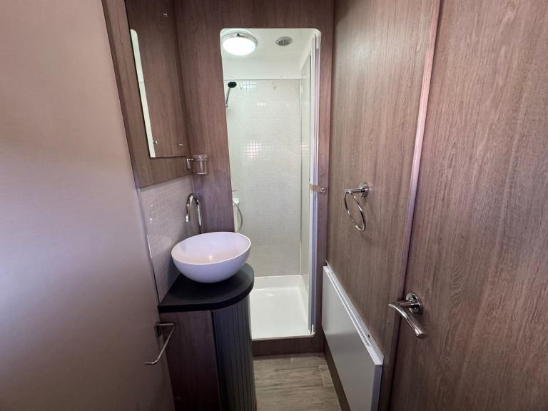 A permanent and incredibly comfortable french bed at the rear allows for a truly restful nights sleep without the need to make up a bed each evening whilst also featuring ample storage underneath. Located at the rear is the washroom including a Thetford cassette toilet, vanity basin and separate fully enclosed shower cubicle, providing a private and well-equipped facility.