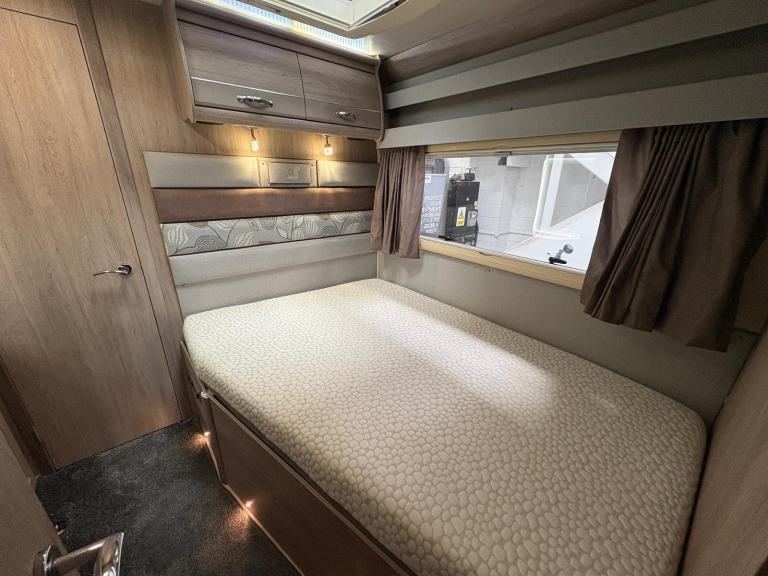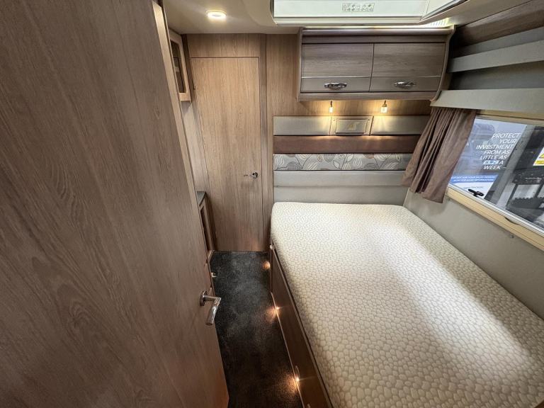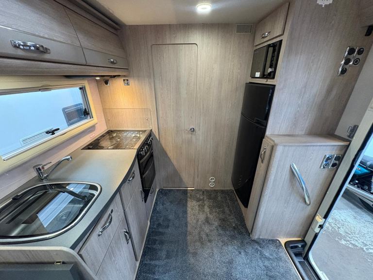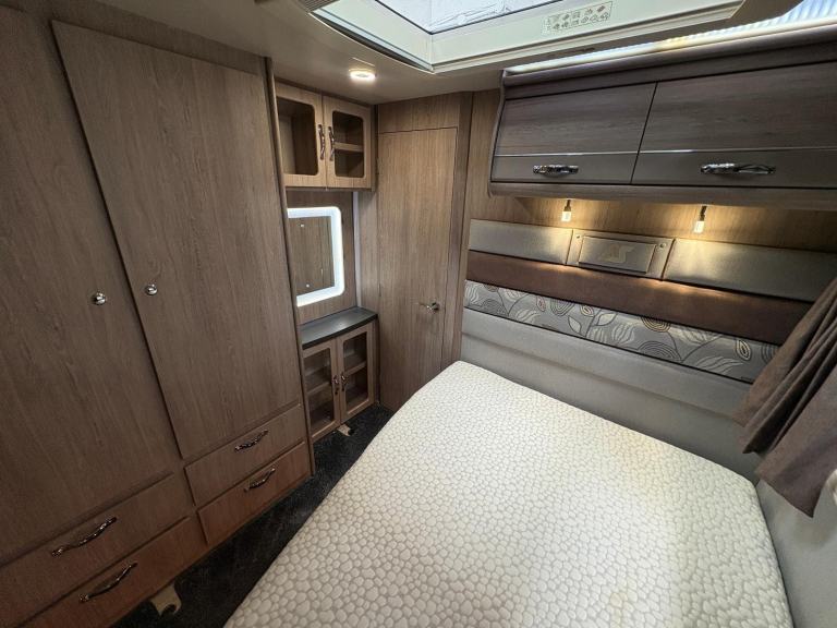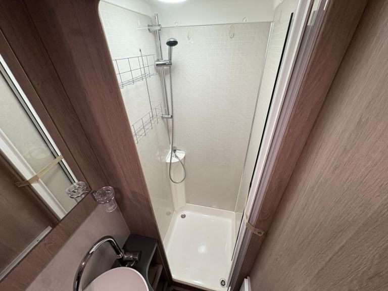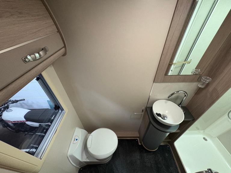 A permanent and incredibly comfortable french bed at the rear allows for a truly restful nights sleep without the need to make up a bed each evening whilst also featuring ample storage underneath. Located at the rear is the washroom including a Thetford cassette toilet, vanity basin and separate fully enclosed shower cubicle, providing a private and well-equipped facility.