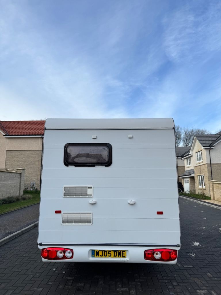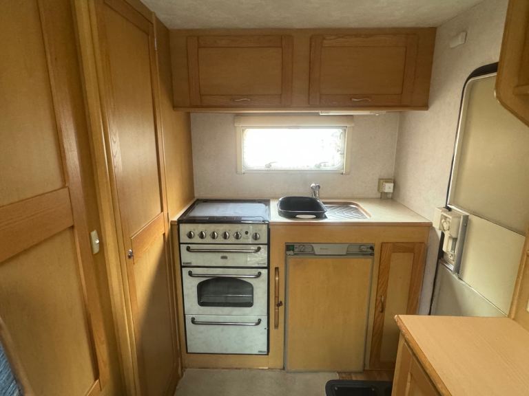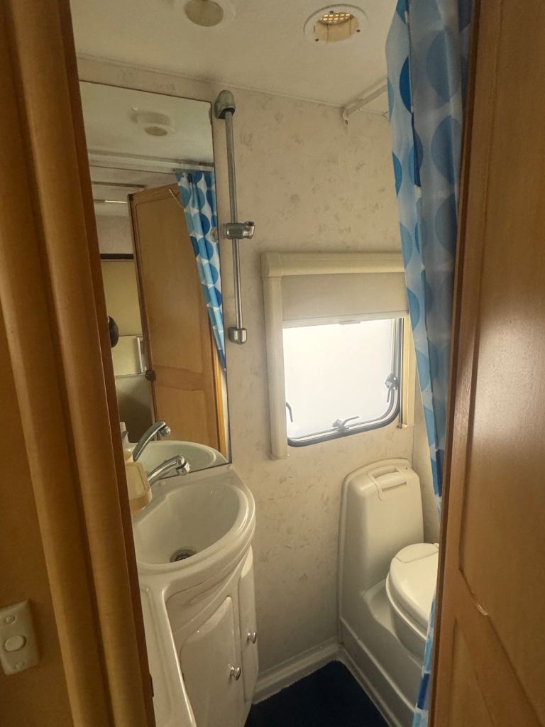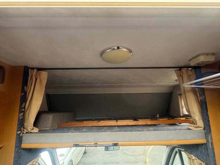 It has 6 seatbelts (4 rear + 2 front), ideal for families. Inside you’ll find bunk beds, dining area, kitchen with hob, oven and sink, fridge, bathroom, plenty of storage, and a diesel electric heater.