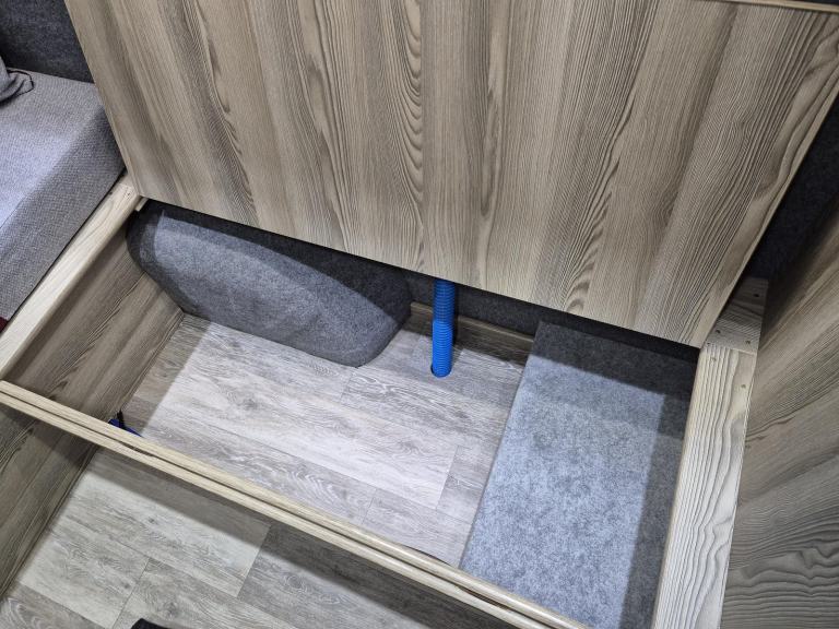 The Truma 2E Combi Gas and Electric Blown Air Water Heater manage heating and hot water. Control it through a digital thermostat with a timer for personalized comfort, utilizing gas, electric, or a combination of both. Conveniently located underneath the vehicle is the the 70L fresh water tank and 50L grey waste tank, made of premium-grade plastic to prevent freezing during winter use. Alongside these tanks there is an underslung 25L LPG Gas tank and an exterior gas BBQ point on the side of the vehicle adding to its functionality.