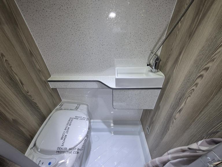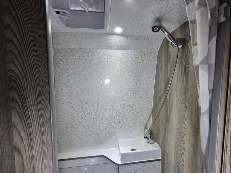 Enjoy the extra-large washroom featuring a Thetford electric flush toilet, a mono mixer shower with curtain, a vanity storage unit, a heating outlet, and a roof extraction vent.