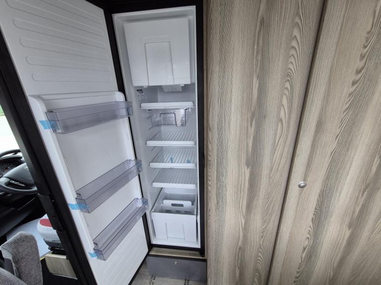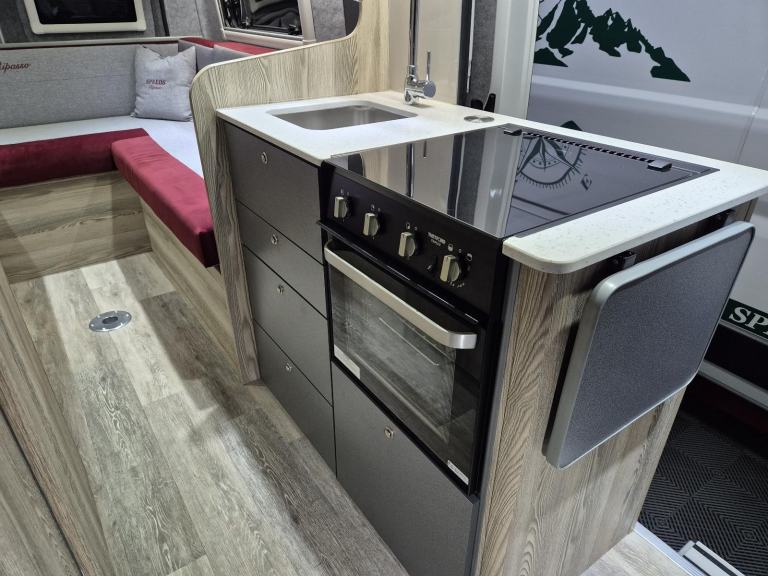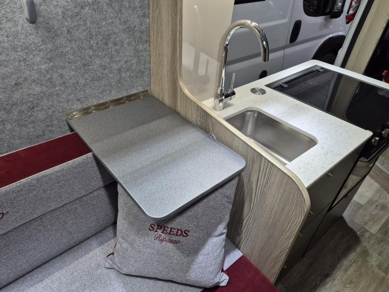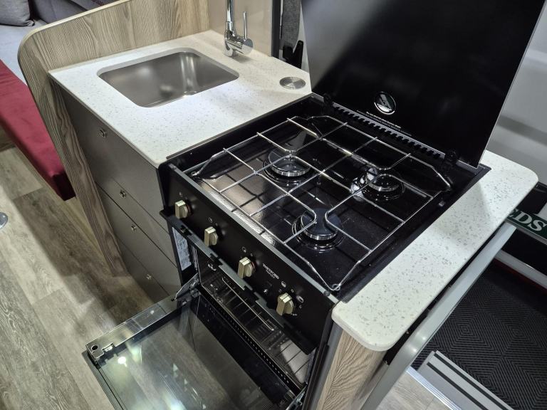 The well-equipped kitchen consists of a stainless counter sunk sink with hot and cold taps, abundant worktop space complemented by pull-up worktops on either side, multiple storage drawers and cupboards and a recessed power tower. It's furnished with a Thetford Triplex 3 burner gas hob/grill and oven, alongside a generous 149L Thetford Compressor Fridge. Additionally, a large electric remote-controlled Maxxfan ensures ventilation and extraction above the kitchen area.