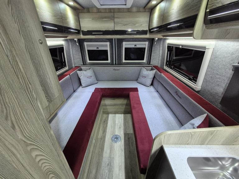 Experience relaxation in the large U-Shaped rear lounge with ample space for comfort. Features include multiple overhead storage units, courtesy lights with USB charge ports and Wireless Charging Pads, a remote-controlled smart TV, panoramic windows with blinds and flyscreens, a roof ventilation outlet, and a half-length floating wardrobe. A sizable dining table is stored above the cab, maximizing space when not in use.