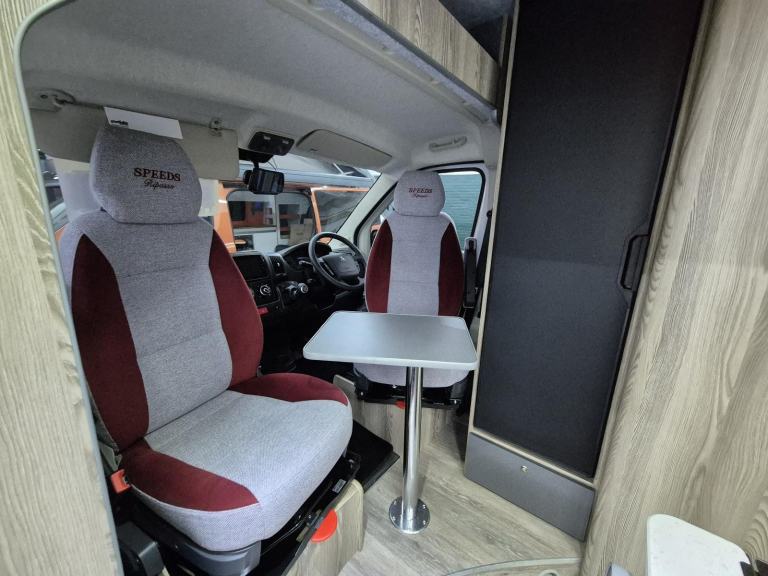 The front cab area boasts twin captain’s swivel chairs upholstered in the exclusive Ripasso fabric trim. A convenient small dinette table is stored above the cab for added functionality.