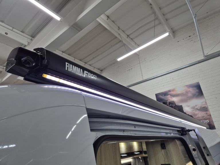 The vehicle offers multiple LED downlighters, rear courtesy lamps with USB charging ports, and recessed lighting under overhead lockers. Individual controls allow customization for the perfect ambient lighting. Additionally, there are 4x 230v mains sockets and 1x 12v socket located in the lounge and kitchen. The vehicle is equipped with 2x 110 Amp deep cycle leisure batteries charged by 2x 100w solar panels fixed to the roof, ensuring sustained power. A NEC Box digital aerial on the roof ensures optimum TV reception, while an LED strip light fixed to the exterior wind-out awning provides external illumination.
