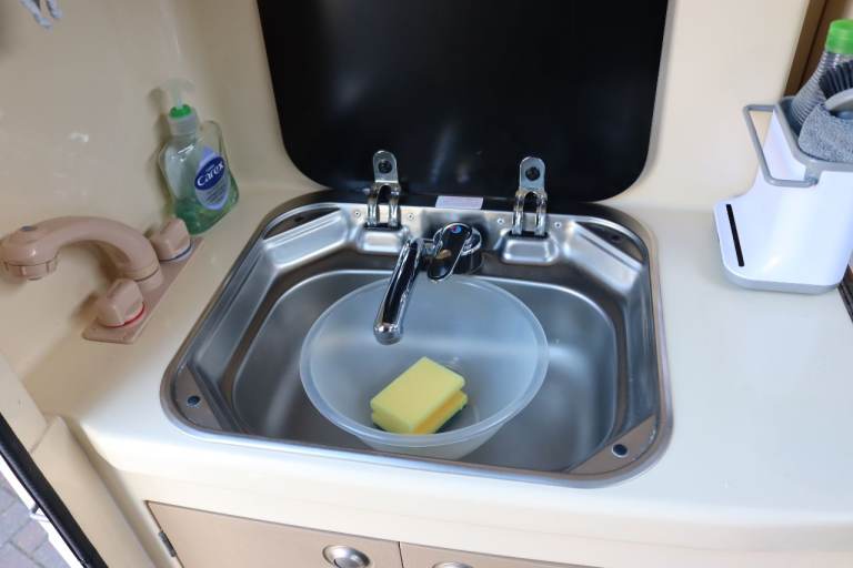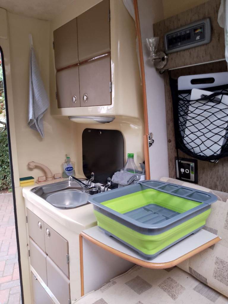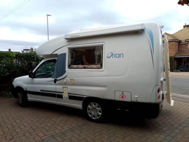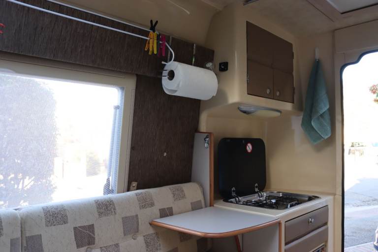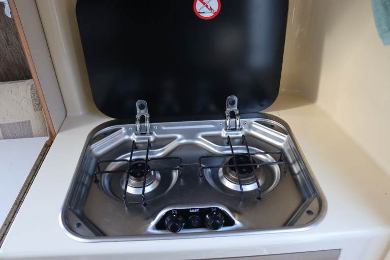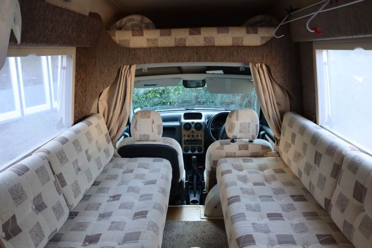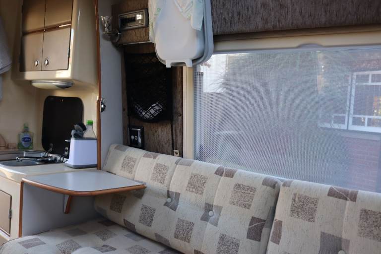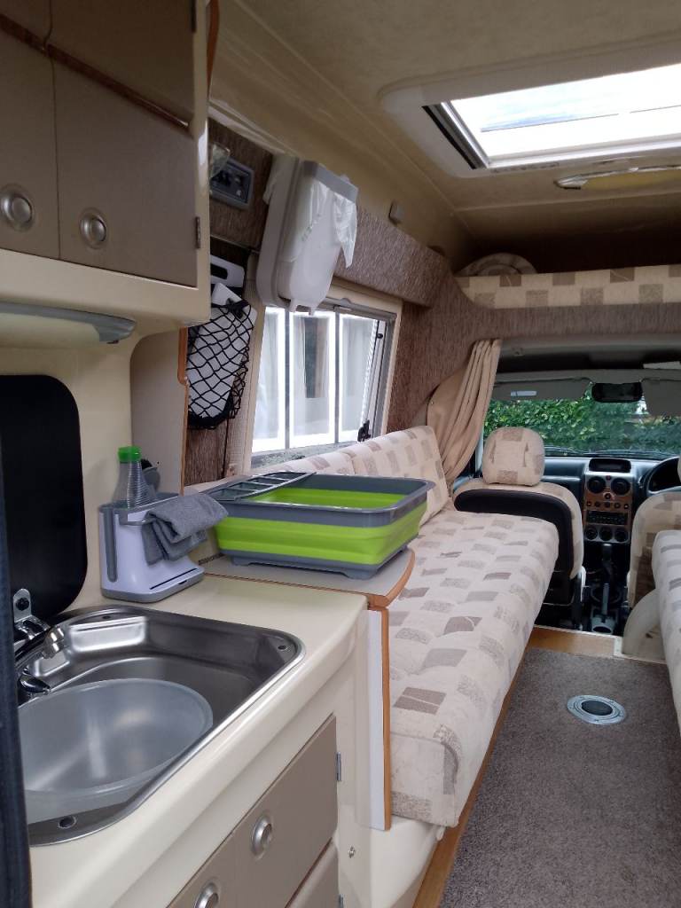 2 berth. Lots of storage space including over cab. Hot and cold running water, hand held shower, 25 litre fresh water tank, waste tank, 3 way fridge with freezer compartment, 2 ring gas hob with grill. Eberspacher diesel blown air heater fully serviced Oct 2025, electric hook up, table, skylight and windows with bug screen and blinds, wind down stabilisers at rear. Porta Potty, twin sofas that convert into two singles or a spacious double bed, plus two single mattress memory foam toppers.