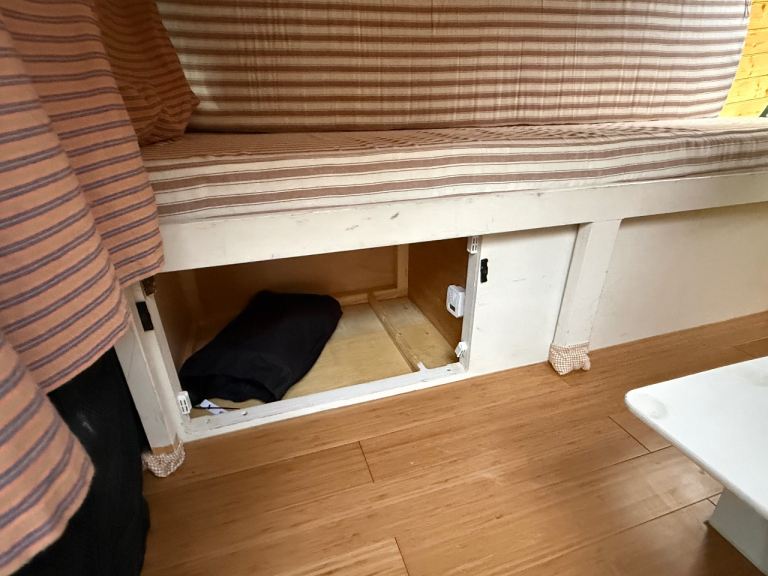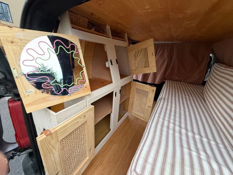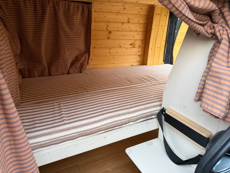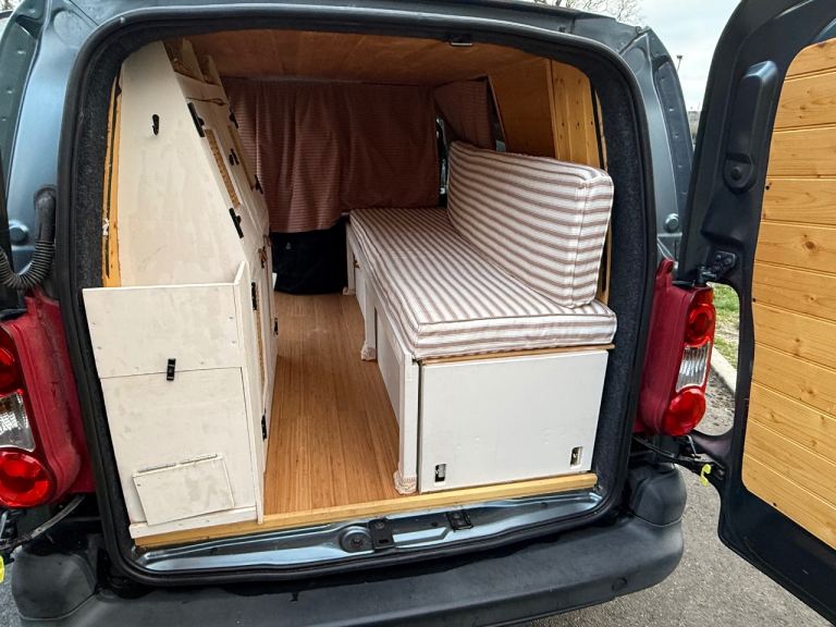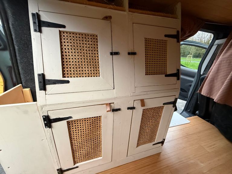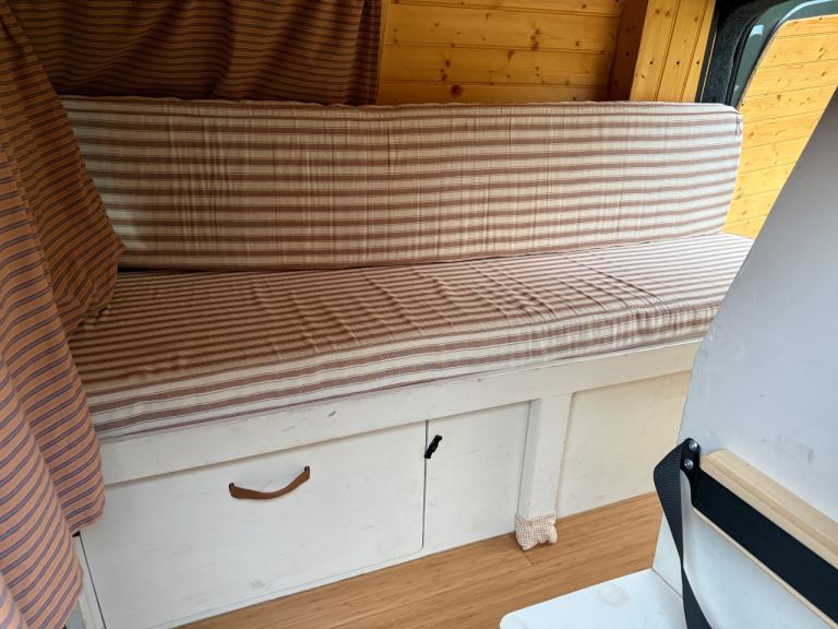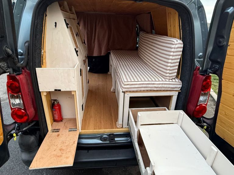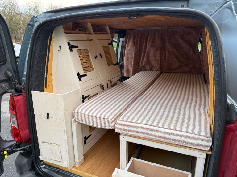 Professionally converted Peugeot Partner camper van. The high quality mattress and black out curtains enable a great night sleep even if you’re over 6 foot tall. Storage in hand-built cabinets to the side for all your camping essentials. Under bead there’s more storage to the front and then a large pull out drawer for your cooker, utensils and food to make a great cooking station.