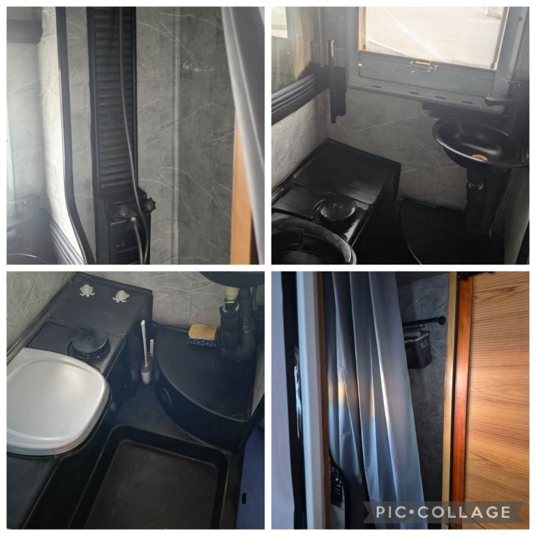 Full bathroom with Thetford Cassette electric flush toilet,sink, mirrored cabinets, shelves, towel rail, toilet roll holder and seperate shower which has new taps, hose shower head (unused) and comfort anti-slip mat.