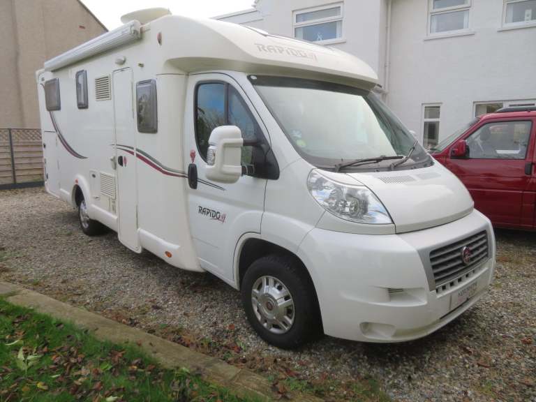 Motorhome Depot North Wales present a very nice Rapido 666f Motorhome, Based on the Fiat chassis this desirable model has covered 58,000 and comes with a good history including a Habitation service in April 2024.The layout is the rear twin fixed bed, the single beds are raised up to create a proper garage beneath, while the facilities are split – shower on the left, toilet and washbasin on the right – with a sliding door to shut off the whole bedroom/washroom.At the Front you have a L shaped lounge area with two traveling seat belts that also converts to the second double bed, this area has lots of daylight to make the most of the space provided, There is full cream leather (fitted by Regal in 2021), Up above there’s not just a giant Remis wind-up rooflight, but an opening overcab sunroof too. And Rapido also fit an extra window behind the single offside inward-facing seat.Opposite, the L-shaped galley comes with a three-burner hob (with split glass lid to preserve worktop space when you’re not using all three rings) and a Baraldi extractor hood (the sort of touch that is a nice surprise at this price level). You also get a 146-litre fridge/freezer.Dimensions: 7.37m L, 2.35m W, 2.76m HBeds: Nearside single 1.97m x 0.79m, offside single 1.96m x 0.81m, or transverse double 2.17m x 1.33m, front dinette bed 2.10m x 0.83m/1.09mPayload: 500kg (estimated)The Motorhome is located in LLandudno,North Wales. Please call Aled on 01248 614028 for further information and a full photo file.