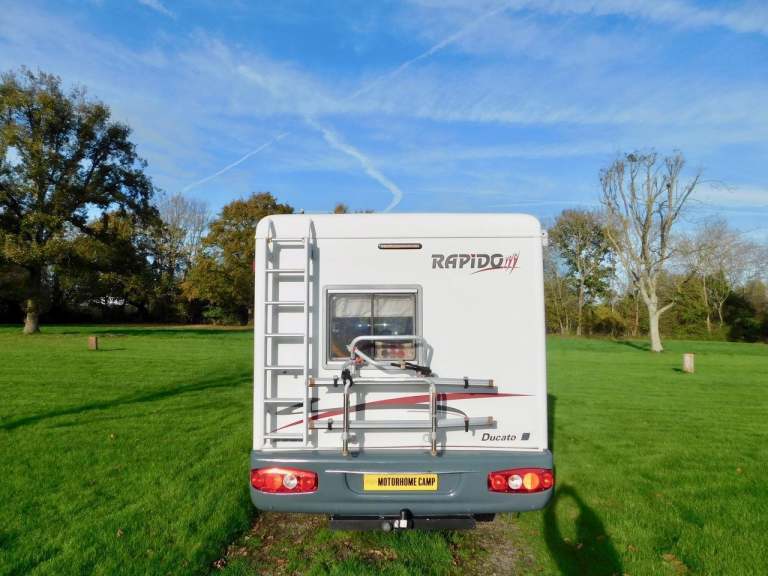 On the Outside we have the Large Roll out Awning as well as the useful Tow bar with electrics and Reverse Parking Sensors, and the rear ladder giving access to the built in Roof Rack. Plus there is a Bike Rack for 2 Bikes.