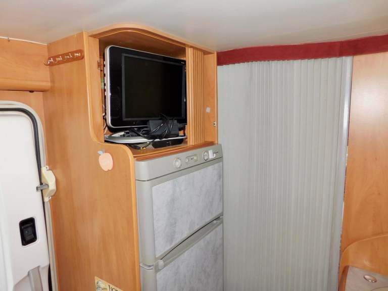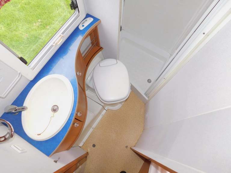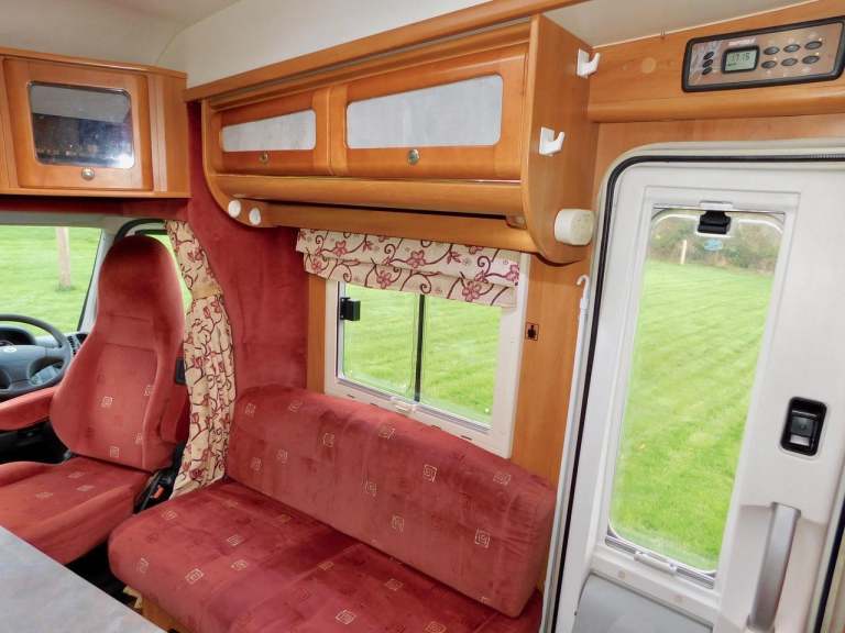 Here we get the Advantage of a Huge Spacious open LOUNGE Plus the Fixed Bed which means that you are Not having to make up your Bed at night, but still have the enjoyment of the Large Lounge complete with its 2 x Sofas and the 2 Swivelling Front Captains Seats becoming part of the LOUNGE and DINING Area. This area easily Converts to an Additional Double Bed. We have a Large Opening Sunroof above the Lounge area, Plus the very Large Opening Windows. We also have the High Quality Habitation Door with its Low Height Entrance, Double Locking points and sliding window with built in Blinds. First registered June 2004 with Only 60,000 miles from New and the last Owner has owned it for the last 15 years..
