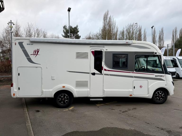 Superb A Class motorhome with everything on board needed for touring, Motorhome Depot are delighted to present this lovely A class motorhome. A 2020 Rapido 883F based on a 2.3 Fiat Ducato. This motorhome is a very well looked after example, in super condition with some great features including solar panel, 2 gas bottles, all seating is in a leather finish, along with a large rear garage which is accessible from both sides externally, a larger door is fitted on the off side. Entering the motorhome via the habitation door, to the rear, there is a full sized double fixed transverse bed with luxurious headboard padding, situated above the rear garage, complete with storage cupboards equipped for a T.V in this area if required. There is an en-suite bathroom with a door that you can close off from the rest of the motorhome. The wash room features a toilet, sink with tap and storage cupboard, opposite is a separate shower cubicle, the washroom has underfloor heating. In the kitchen area there is firstly a large full size fridge freezer, opposite a well-appointed kitchen area, with stainless steel sink with tap above, an oven with separate 3 gas burner hob and lots of storage space in the eye line cupboards. An extendable worktop area can be clipped on. In the living and dining area there are two bench seats along with 2 swivel seats both drivers and passengers seat which allow for entertaining guests. The dining table can be folded in half when full size is not required. The very large over cab bed provides another two berths and is of very generous proportions.VEHICLE DIMENSIONS. Overall length 6,99 Overall width 2,35 Overall width with rear view mirrors open 2,76 Overall height 2,89 Number of seatbelts 4, Gross vehicle weight 3650kg Chassis fiat ducato, Engine 2,3 L - 140 hp EURO 6, STORAGE AREA/GARAGE (CM) Internal dimensions (max H x max W) 116 x 99 Access right side (H x W) 110 x 87 side (H x W) 70 x 87 Type of heating Truma Combi 6, BED SIZES (MM) Rear bed 1400 x 2030, Over cab drop-down bed 1400 x 1910 Capacity of fresh water tank 140 / Capacity of waste water tank 120 / Type of refrigerator Absorption Refrigerator capacity 149 L.*The information provided in this advert is for guidance purposes only. Specifications, features, layout, weights, dimensions and equipment may differ from the manufacturer’s original specification or vary between individual vehicles. Prospective purchasers should not rely solely on this information and are advised to confirm all details prior to purchase.The vehicle is supplied with a 12 month third party warranty, habitation check and engine service.