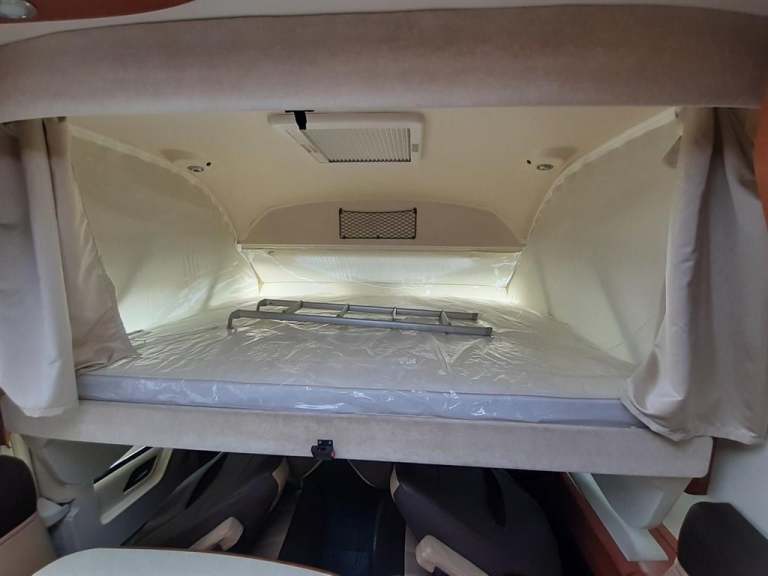 The interior layout of this Rapido 9090DF consists of a large rear bedroom with an island bed with ample storage and wardrobes. Midway is this washroom with a WC & wash basin/vanity unit with a separate shower cubical adjacent. Moving forward you will find a kitchen area equipped with 3 x gas hob, an oven & grill, a sink with mixer tap & a large fridge/freezer. To the front of this Rapido is the living/dining area which incorporates the cab seats which both swivel maximising this space. Above the cab is a large double bed that conveniently pulls down when needed.
